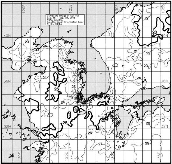◦ 금주(2015. 09. 15~2015. 09. 21)의 한국근해 표면수온은 대화퇴 근해 20~21도, 울릉도-독도 근해 22~23도, 대마도 근해 24~25도, 제주도 근해 24~26도, 이어도 근해 25~26도, 가거초 근해 24~25도, 어청도 근해 22~23도, 백령도 근해 21∼23도로 나타납니다.