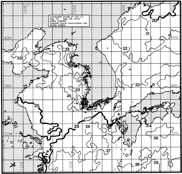 ◦ 금주(2015. 09. 22~2015. 09. 28)의 한국근해 표면수온은 대화퇴 근해 21~22도, 울릉도-독도 근해 22~23도, 대마도 근해 24~25도, 제주도 근해 24~26도, 이어도 근해 25~26도, 가거초 근해 24~25도, 어청도 근해 22~23도, 백령도 근해 20∼22도로 나타납니다. ◦ 「평년에 비해」대화퇴 근해 비슷하게, 울릉도-독도 근해 비슷하게, 대마도 근해 0.6도 낮게, 제주도 근해 비슷하게, 이어도 근해 0.7도 높게, 가거초 근해 1.2도 높게, 어청도 근해 0.9도 높게 나타납니다. ◦「전년에 비해」대화퇴 근해 1.5도 낮게, 울릉도-독도 근해 2도 낮게, 대마도 근해 1도 낮게, 제주도 근해 비슷하게, 이어도 근해 1도 높게, 가거초 근해 0.5도 높게, 어청도 근해 비슷하게, 백령도 근해 1도 높게 나타납니다. ◦ 수온 전선대는 우리나라 제주해협에서 대한해협까지 24도를 중심으로 형성됩니다. =$row['content']?> =$row['content']?> =$row['content']?> |