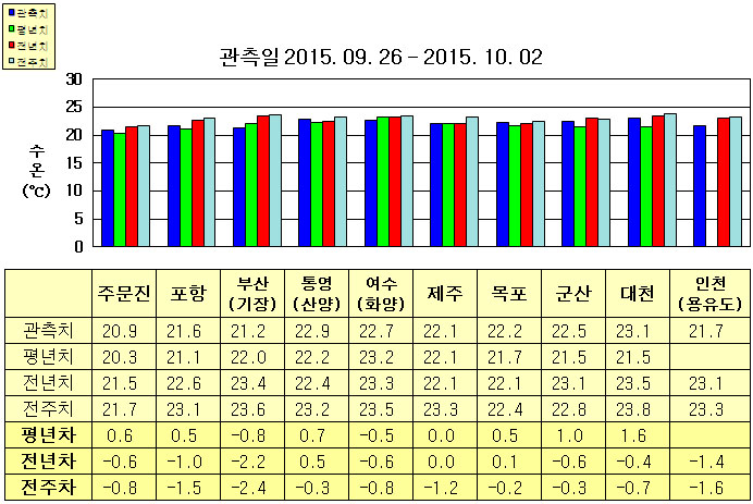 ◦ 금주(2015. 09. 26~2015. 10. 02)의 한반도 연안 표면수온은 동해 연안역에서 섭씨 20.5~22.0도, 남해 연안역 22~23도, 서해 연안역에서 21.5~23.5도로 나타납니다. ◦ 평년에 비해 부산(기장) 0.8도 낮음을 제외한 동해 연안역은 0.5~1.0도 높게, 남해 연안역은 통영(산양) 0.7도 ?瘠?, 여수(화양) 0.5도 낮게, 제주 비슷하게, 서해 연안역은 0.5~2.0도 높게 나타납니다. ◦ 전년에 비해 동해 연안역은 0.5~2.5도 낮게, 남해 연안역은 통영(산양) 0.5도 높게, 여수(화양) 0.6도 낮게, 제주 비슷하게, 목포 비슷함을 제외한 서해 연안역은 0.5~1.5도 낮게 나타납니다. |