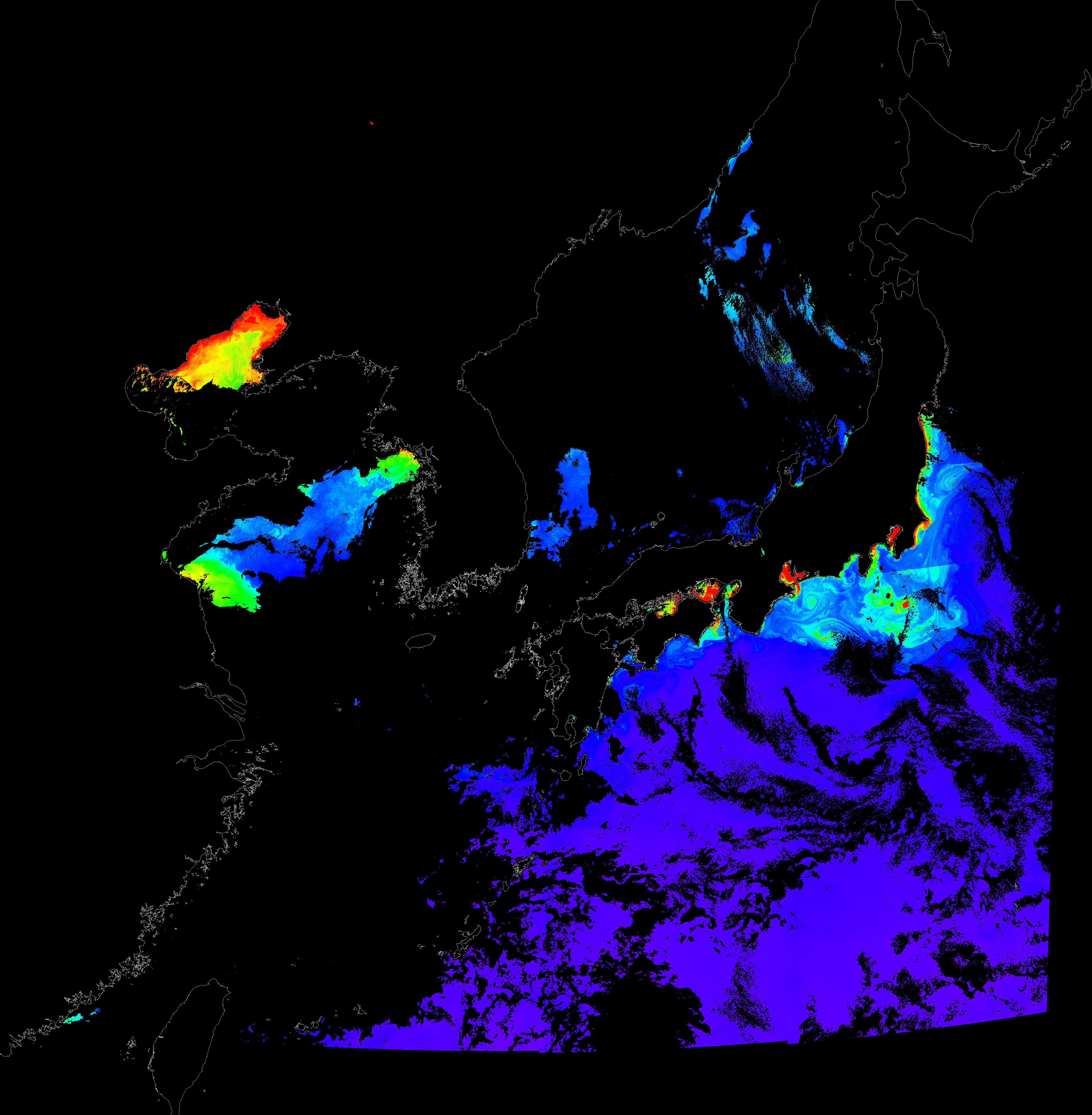 o 2015년 10월 8일 천리안 GOCI 클로로필 a 위성영상입니다.