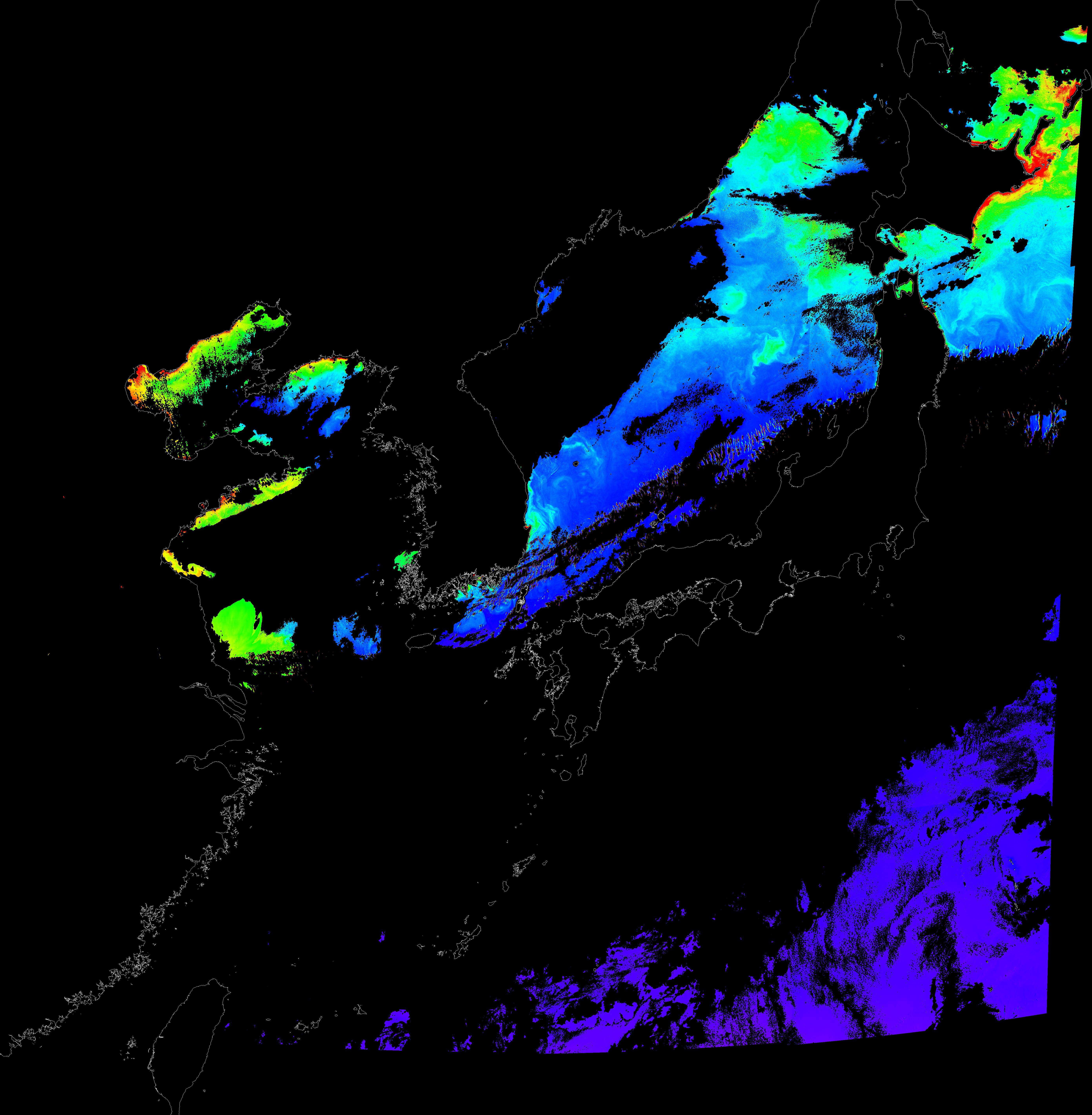 o 2015년 10월 10일 천리안 GOCI 클로로필 a 위성영상입니다.