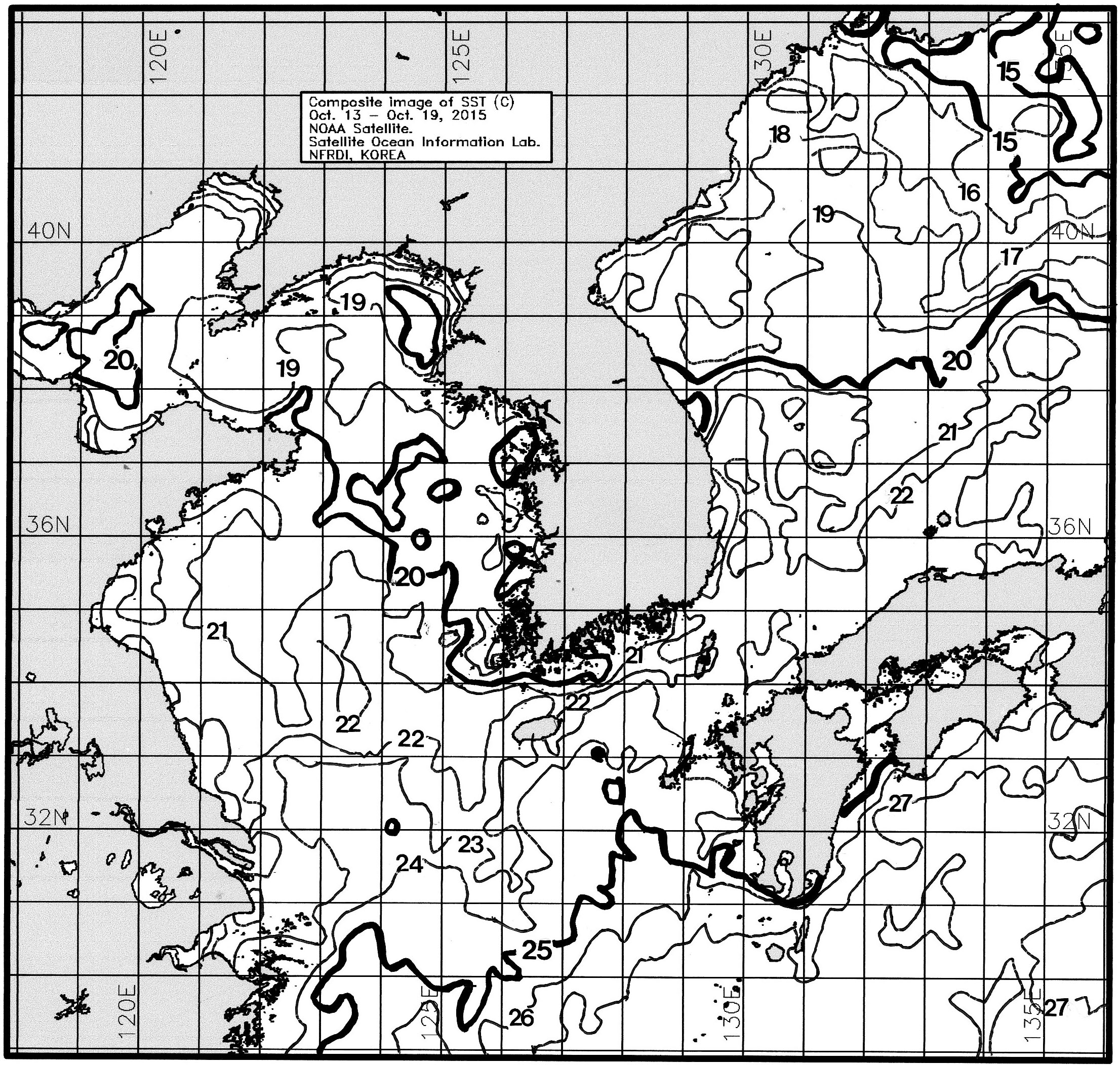 ◦ 금주(2015. 10. 13~2015. 10. 19)의 한국근해 표면수온은 대화퇴 근해 18~19도, 울릉도-독도 근해 21~22도, 대마도 근해 21~23도, 제주도 근해 22~23도, 이어도 근해 22~23도, 가거초 근해 20~22도, 어청도 근해 19~20도, 백령도 근해 18∼19도로 나타납니다.