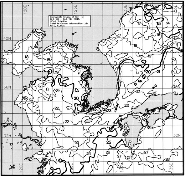 ◦ 금주(2015. 10. 20~2015. 10. 26)의 한국근해 표면수온은 대화퇴 근해 18~20도, 울릉도-독도 근해 20~22도, 대마도 근해 23~24도, 제주도 근해 22~24도, 이어도 근해 22~23도, 가거초 근해 20~22도, 어청도 근해 19~20도, 백령도 근해 17∼19도로 나타납니다.