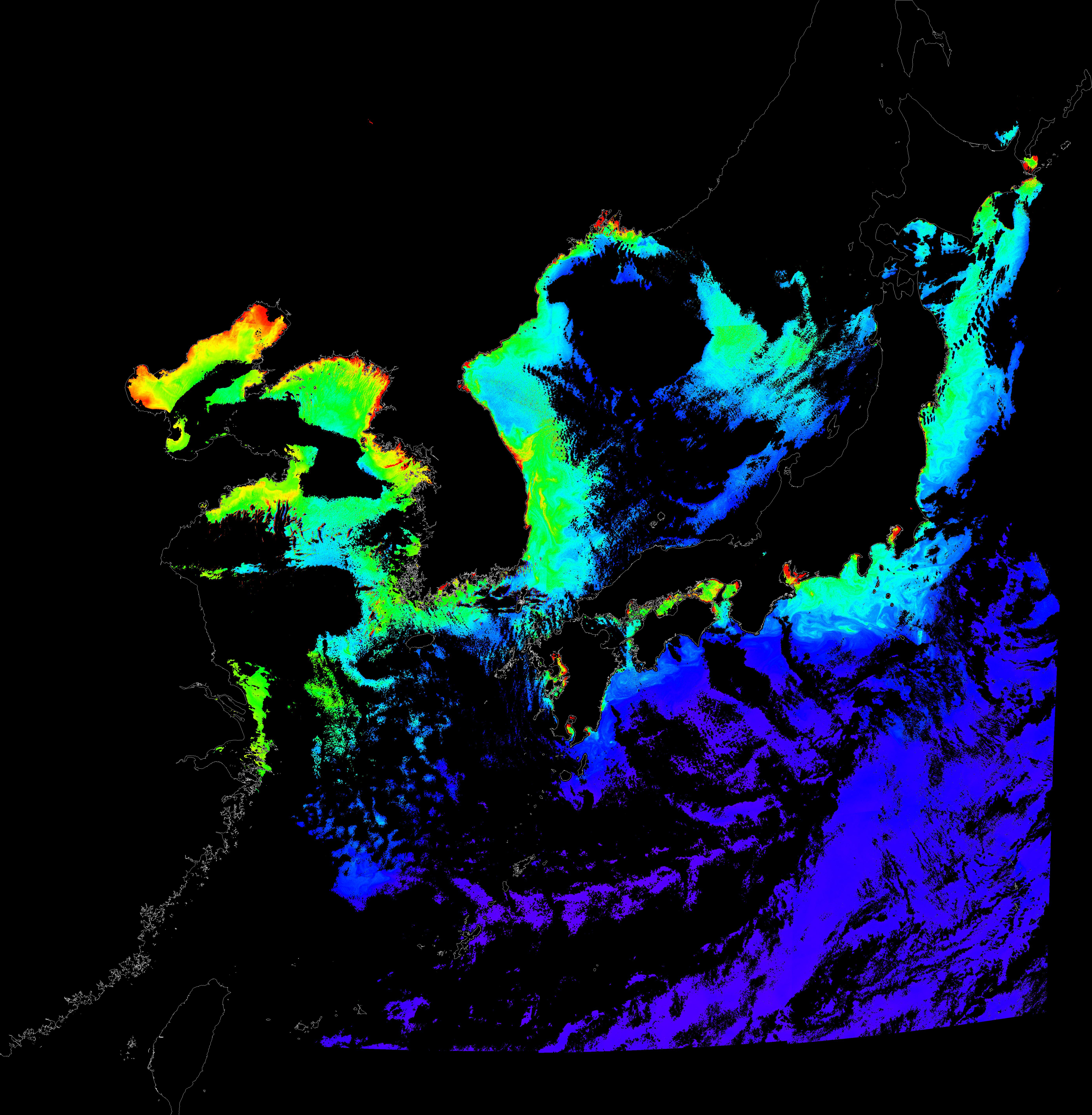 o 2015년 10월 28일 천리안 GOCI 클로로필 a 위성영상입니다.