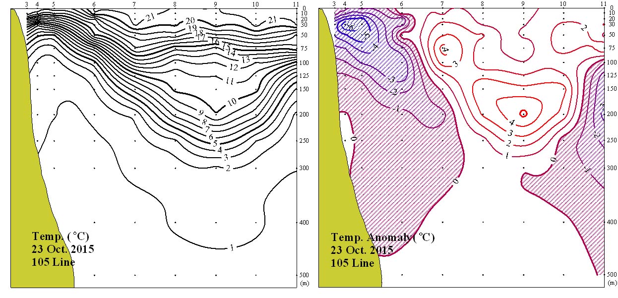 =$row[content]?> ◦ 2015년 10월 23일 국립수산과학원 동해수산연구소에서 조사한 105선(동해 동방)의 수직수온분포도 및 평년편차도입니다. ◦ 수온약층은 10℃를 중심으로 20~300m 부근에서 형성되었으며 연안에서 외해로 갈수록 수온약층 형성수심이 깊어졌습니다. ◦ 평년에 비하여 정점 6~11 사이에서 1~5℃ 범위의 고온현상을 보였으며, 나머지 해역에서는 1~6℃ 범위의 저온현상을 보였습니다. =$row[content]?>=$row[content]?>=$row['content']?> =$row[content]?>=$row[content]?>=$row['content']?> =$row['content']?> =$row['content']?> =$row['content']?> |