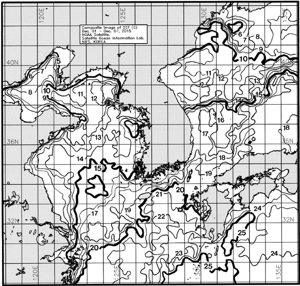 ◦ 금주(2015. 12. 01~2015. 12. 07)의 한국근해 표면수온은 대화퇴 근해 15~16도, 울릉도-독도 근해 15~17도, 대마도 근해 19~20도, 제주도 근해 19~21도, 이어도 근해 18~19도, 가거초 근해 16~17도, 어청도 근해 14~15도, 백령도 근해 12∼13도로 나타납니다.