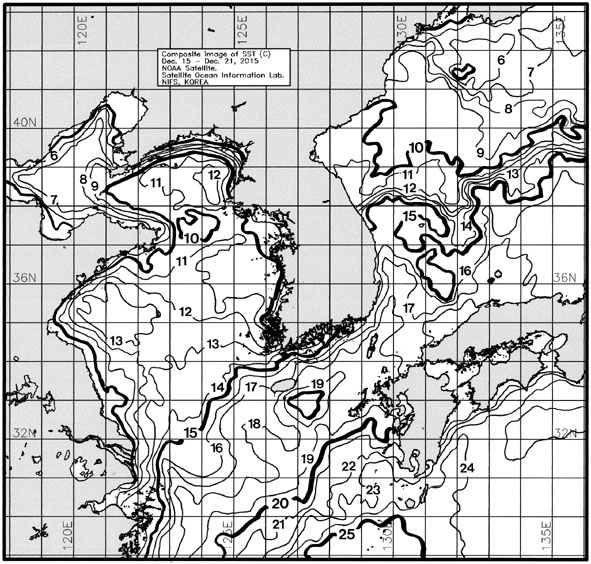 ◦ 금주(2015. 12. 15~2015. 12. 21)의 한국근해 표면수온은 대화퇴 근해 11~13도, 울릉도-독도 근해 14~15도, 대마도 근해 17~18도, 제주도 근해 17~18도, 이어도 근해 17~18도, 가거초 근해 14~15도, 어청도 근해 11~12도, 백령도 근해 10∼12도로 나타납니다. ◦ 「평년에 비해」대화퇴 근해 1.3도 높게, 울릉도-독도 근해 0.7도 낮게, 대마도 근해 0.7도 낮게, 제주도 근해 비슷하게, 이어도 근해 2.2도 높게, 가거초 근해 비슷하게, 어청도 근해 비슷하게 나타납니다. ◦「전년에 비해」대화퇴 근해 4.5도 높게, 울릉도-독도 근해 1도 높게, 대마도 근해 1도 낮게, 제주도 근해 0.5도 높게, 이어도 근해 4.5도 높게, 가거초 근해 2도 높게, 어청도 근해 0.5도 높게, 백령도 근해 1.5도 높게 나타납니다. ◦ 수온 전선대는 우리나라 제주해협에서 대한해협까지 16도를 중심으로 형성됩니다. |