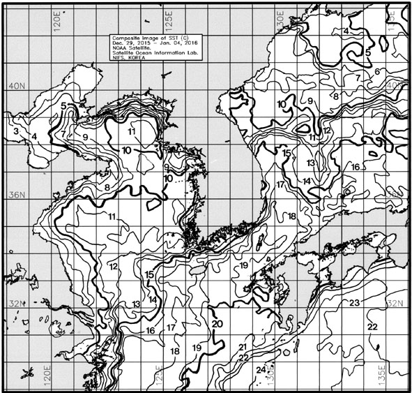 ◦ 금주(2015. 12. 29~2016. 01. 04)의 한국근해 표면수온은 대화퇴 근해 11~12도, 울릉도-독도 근해 13~14도, 대마도 근해 18~20도, 제주도 근해 17~19도, 이어도 근해 15~17도, 가거초 근해 12~13도, 어청도 근해 10~11도, 백령도 근해 10∼11도로 나타납니다.