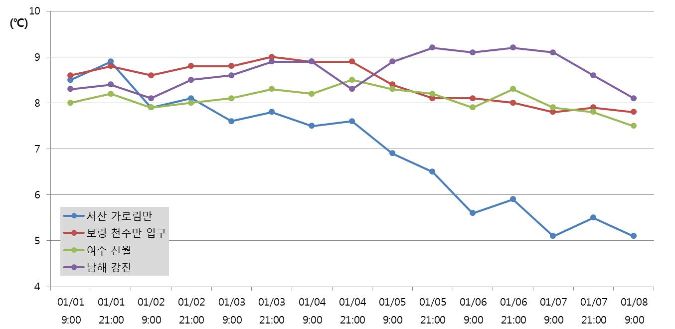 ◦ 국립수산과학원에서 설치 운영하고 있는 실시간 해양환경어장정보시스템 관측 자료의 분석 결과, 서해(서산 가로림만, 보령 천수만 입구)와 남해(여수 신월, 남해 강진)에서의 최근 수온 변동 경향은 아래와 같음 (01월 01∼08일). ◦ 수온은 지난주에 비해 서산 가로림만에서 3℃ 하강하고, 그 외 해역에서 1℃ 하강하고 있음.