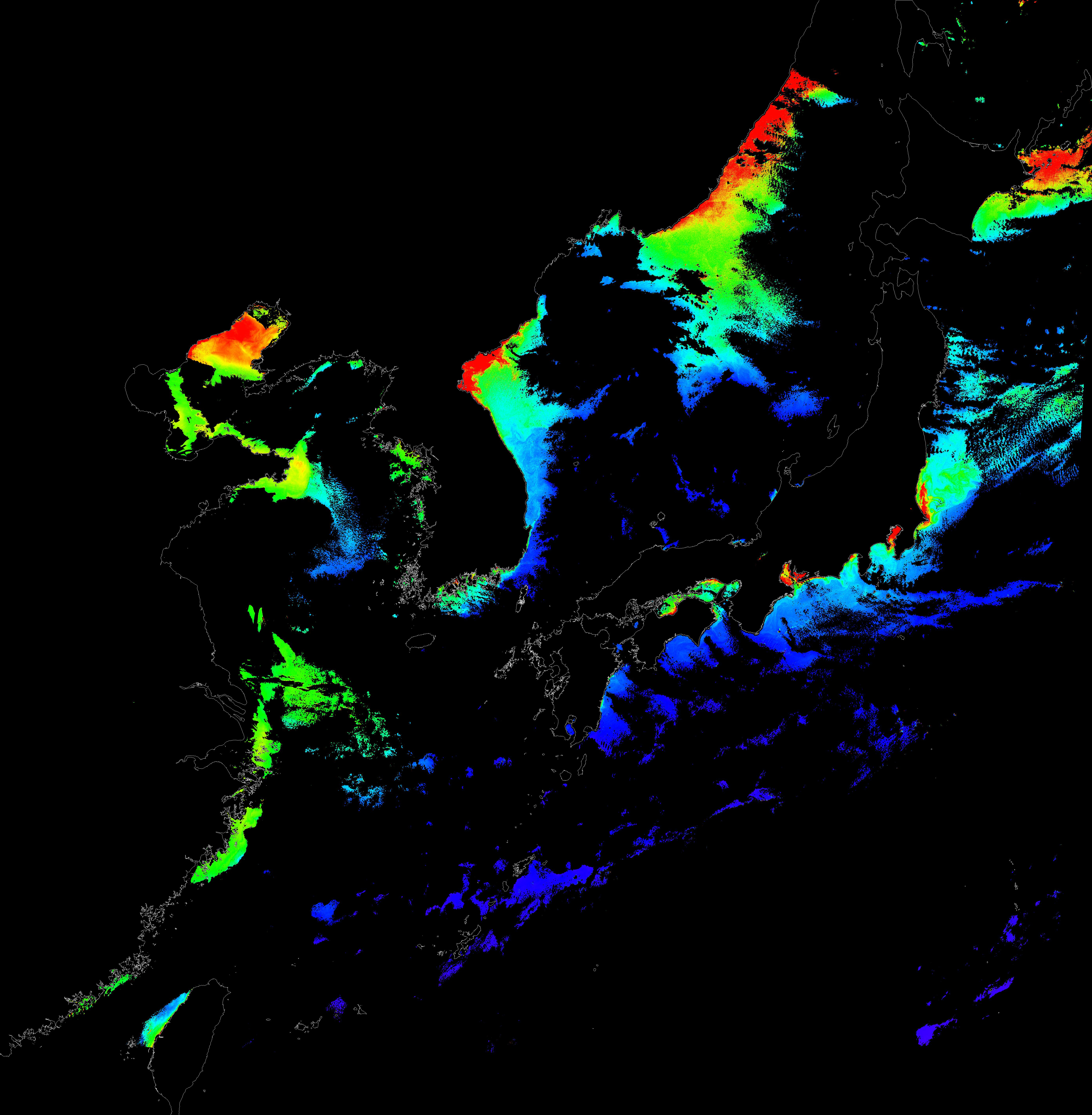 o 2016년 1월 9일 천리안 GOCI 클로로필 a 위성영상입니다.