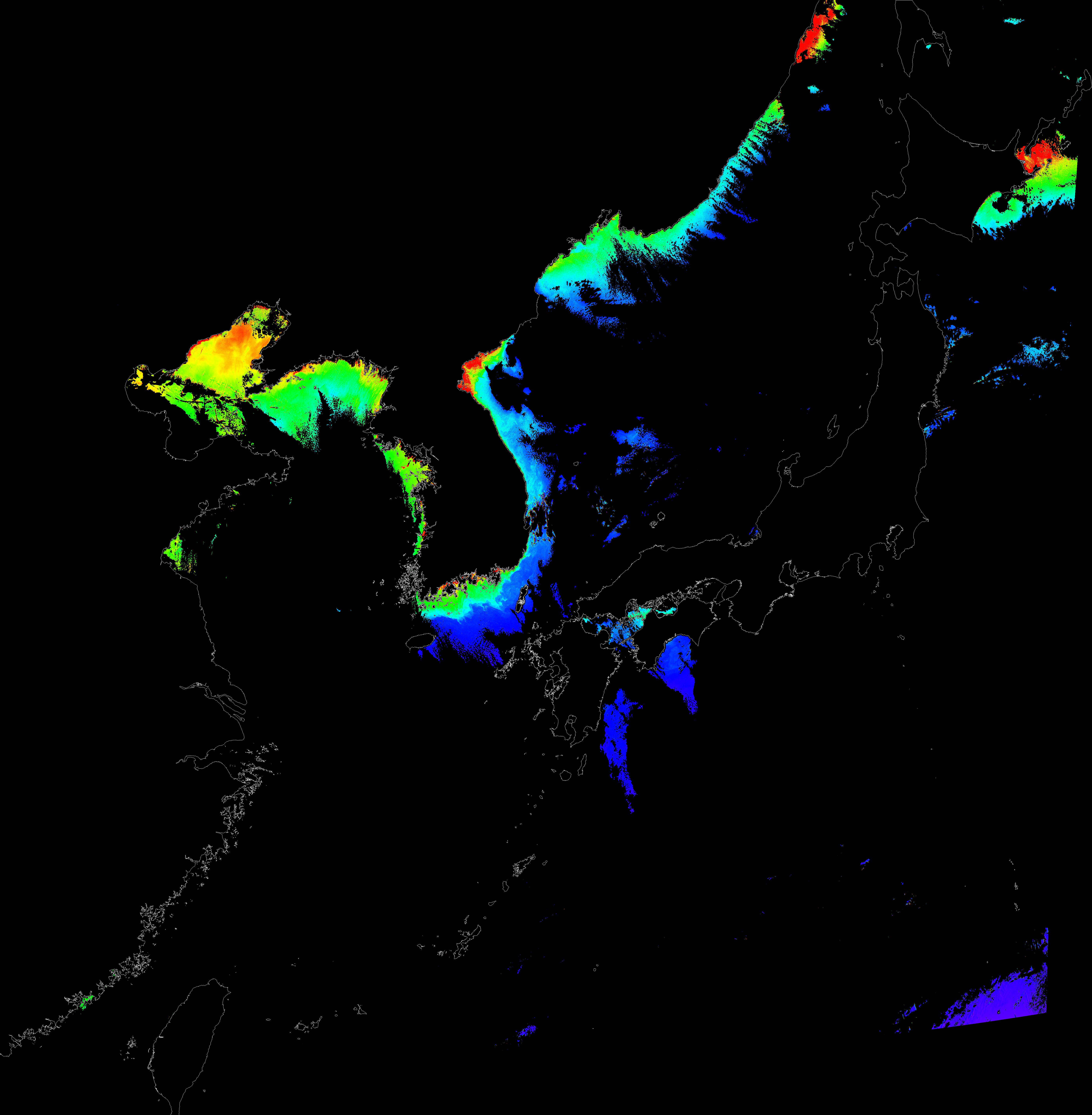 o 2016년 1월 12일 천리안 GOCI 클로로필 a 위성영상입니다.