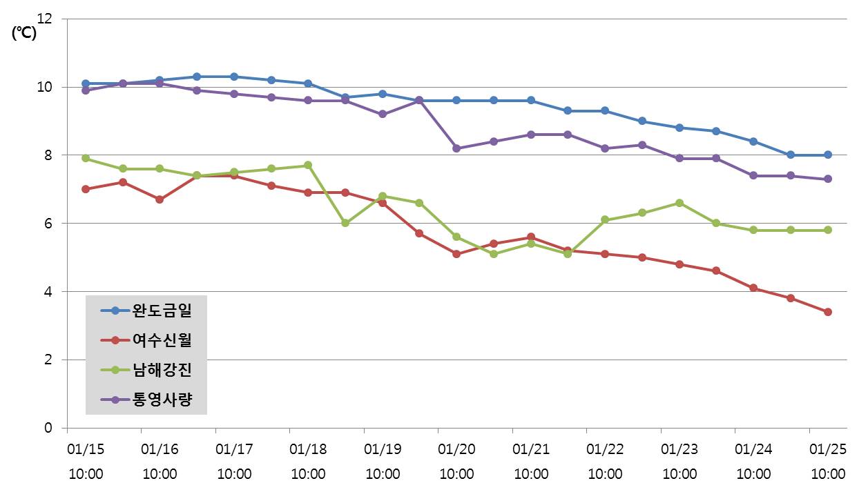 ◦ 해양자료속보 제4816호(2016.01.19.), 제4817호(2016.01.21.) 관련 정보입니다. ◦ 국립수산과학원에서 설치 운영하고 있는 실시간 양식어장 해양환경관측시스템 자료의 분석 결과 남해(완도 금일, 여수 신월, 남해 강진, 통영 사량)연안에서의 최근 수온 변동 경향은 아래와 같음 (1월 15∼25일). ◦ 1월 25일 현재 수온은 1월 18일에 비해 여수 신월에서 3.5℃ 하강하고, 그 외 완도 금일, 남해 강진, 통영 사량에서는 2℃ 내외로 하강하고 있음.