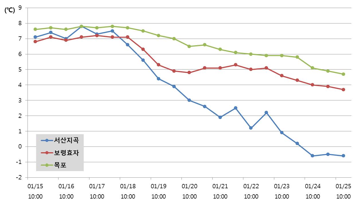 ◦ 해양자료속보 제4816호(2016.01.19.), 제4817호(2016.01.21.) 관련 정보입니다. ◦ 국립수산과학원에서 설치 운영하고 있는 실시간 양식어장 해양환경관측시스템 자료의 분석 결과 서해(서산 지곡, 보령 효자, 목포)연안에서의 최근 수온 변동 경향은 아래와 같음 (1월 15∼25일). ◦ 1월 25일 현재 수온은 1월 18일에 비해 서산 지곡에서 6℃ 하강하고, 그 외 보령 효자, 목포에서는 3℃ 하강하고 있음. ◦ 1월 25일 현재 수온은 서산 지곡은 –0.6℃ 내외로 나타나며, 그 외 보령 효자 3.7℃, 목포 4.7℃를 보이고 있음. ◦ 1월 25일 10시 기준, 현재 수온은 지난 5년(2011년-2015년)간 평균 수온에 비해 서산 지곡 3.5℃, 보령 효자 1.2℃, 목포 0.5℃ 낮게 나타남. - 5년간 평균 수온(1월 25일 기준) : 서산 지곡 2.9℃, 보령 효자 4.9℃, 목포 5.2℃ * 저수온이 일정기간 지속 시에는 양식생물의 체액이 결빙되어 세포 팽창 및 균형 소실로 생존에 영향을 줄 수 있어 일시 대량 폐사 발생 가능성이 있음. * 특히, 서해 및 남해 내만과 연안역의 천해양식장에서는 양식생물들의 저수온에 의한 피해 예방에 만전을 기해주시기 바람. =$row['content']?> =$row['content']?> =$row['content']?> |