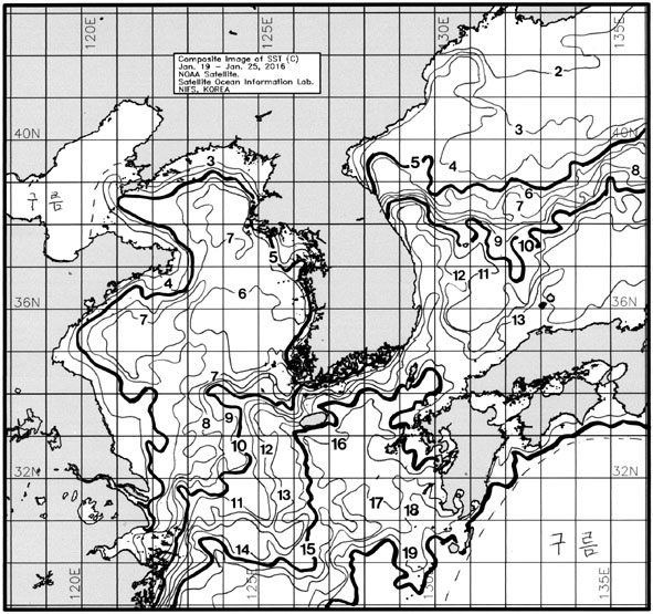 ◦ 금주(2016. 01. 19~2016. 01. 25)의 한국근해 표면수온은 대화퇴 근해 7~8도, 울릉도-독도 근해 10~11도, 대마도 근해 14~15도, 제주도 근해 14~16도, 이어도 근해 10~12도, 가거초 근해 9~11도, 어청도 근해 6~7도, 백령도 근해 6∼7도로 나타납니다. ◦ 「평년에 비해」대화퇴 근해 비슷하게, 울릉도-독도 근해 1도 낮게, 대마도 근해 0.8도 낮게, 제주도 근해 비슷하게, 이어도 근해 비슷하게, 가거초 근해 0.5도 낮게, 어청도 근해 비슷하게 나타납니다. ◦ 「전년에 비해」대화퇴 근해 1도 낮게, 울릉도-독도 근해 2도 낮게, 대마도 근해 1도 낮게, 제주도 근해 0.5도 낮게, 이어도 근해 0.5도 낮게, 가거초 근해 비슷하게, 어청도 근해 비슷하게, 백령도 근해 비슷하게 나타납니다. ◦ 수온 전선대는 우리나라 제주해협에서 대한해협까지 14도를 중심으로 형성됩니다. |