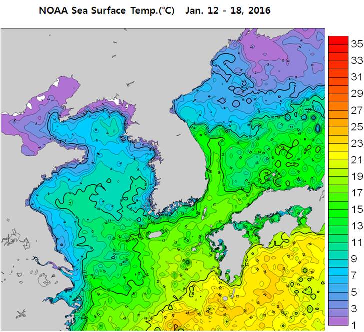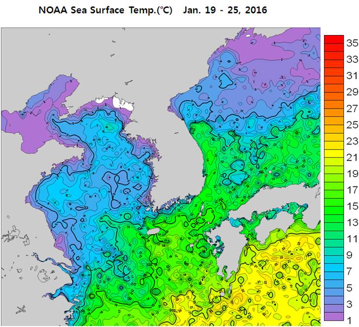 ◦ 한파 영향을 받은 한국근해 1월 3주차 평균 표면수온은 서해 연안 섭씨 1~5도, 남해 연안 4~8도, 동해 연안 9∼12도로 나타납니다.
