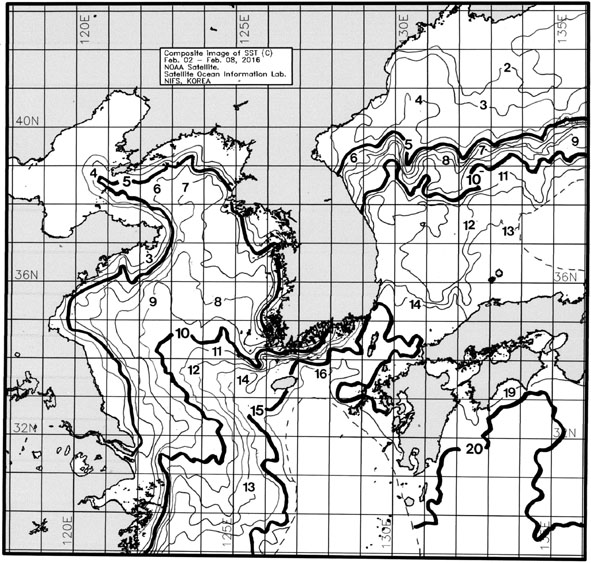 ◦ 금주(2016. 02. 02~2016. 02. 08)의 한국근해 표면수온은 대화퇴 근해 8~9도, 울릉도-독도 근해 12~13도, 대마도 근해 14~15도, 제주도 근해 14~16도, 이어도 근해 10~11도, 가거초 근해 8~9도, 어청도 근해 7~8도, 백령도 근해 6∼7도로 나타납니다. ◦ 「평년에 비해」대화퇴 근해 1.2도 높게, 울릉도-독도 근해 0.9도 높게, 대마도 근해 0.6도 높게, 제주도 근해 비슷하게, 이어도 근해 1.1도 높게, 가거초 근해 1.8도 높게, 어청도 근해 1.9도 높게 나타납니다.