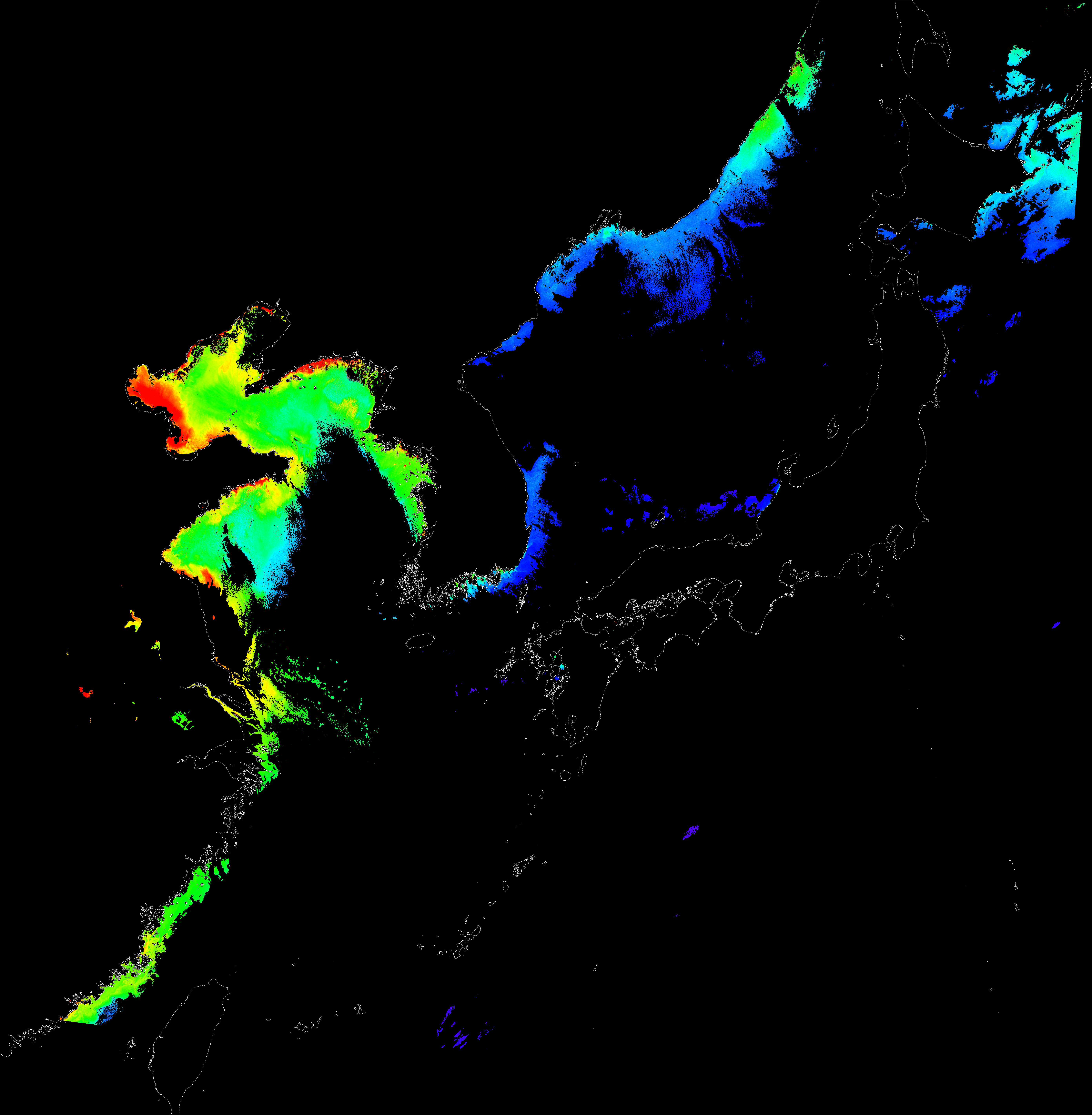o 2016년 2월 6일 천리안 GOCI 클로로필 a 위성영상입니다.
