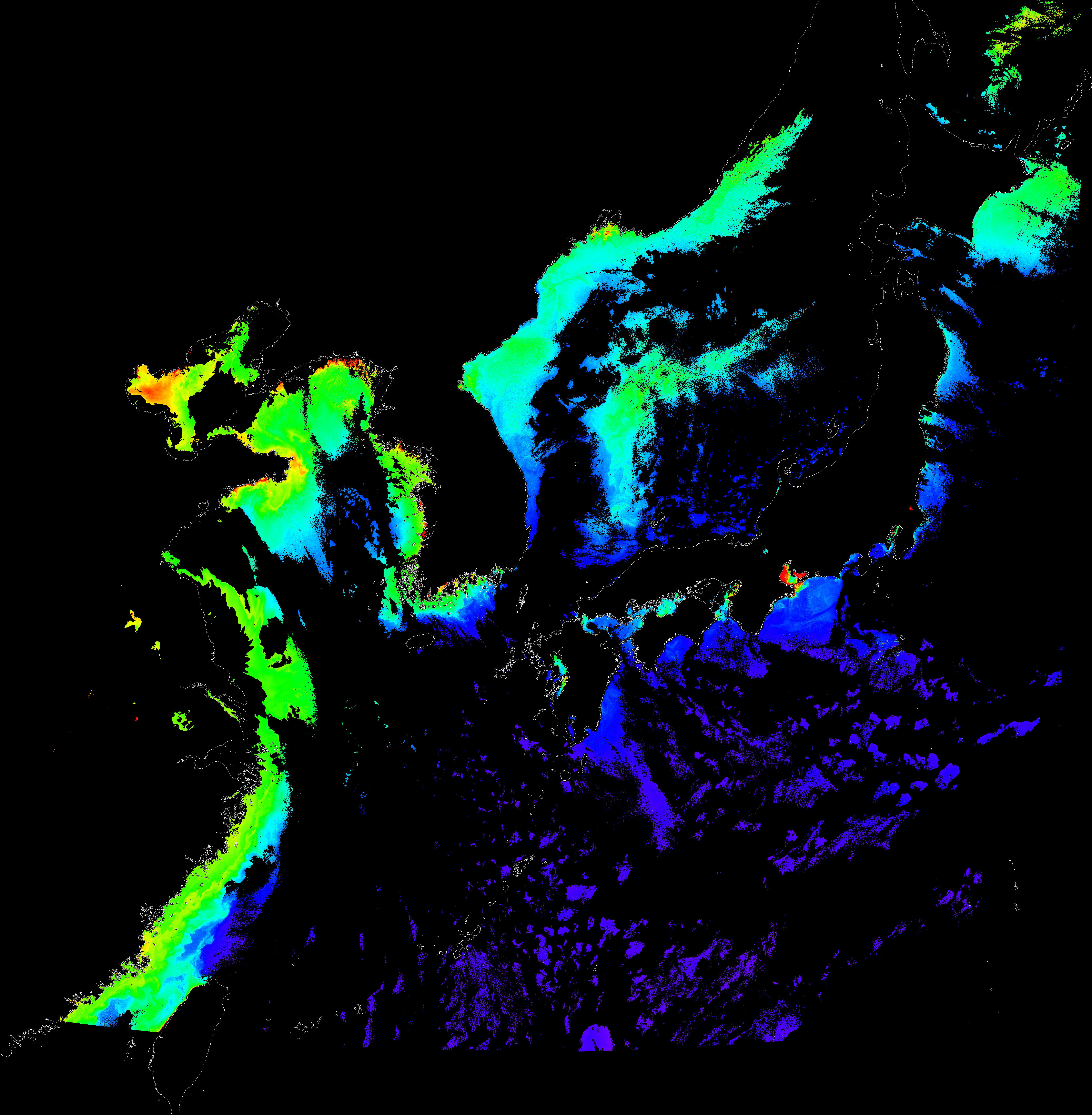 o 2016년 2월 7일 천리안 GOCI 클로로필 a 위성영상입니다.