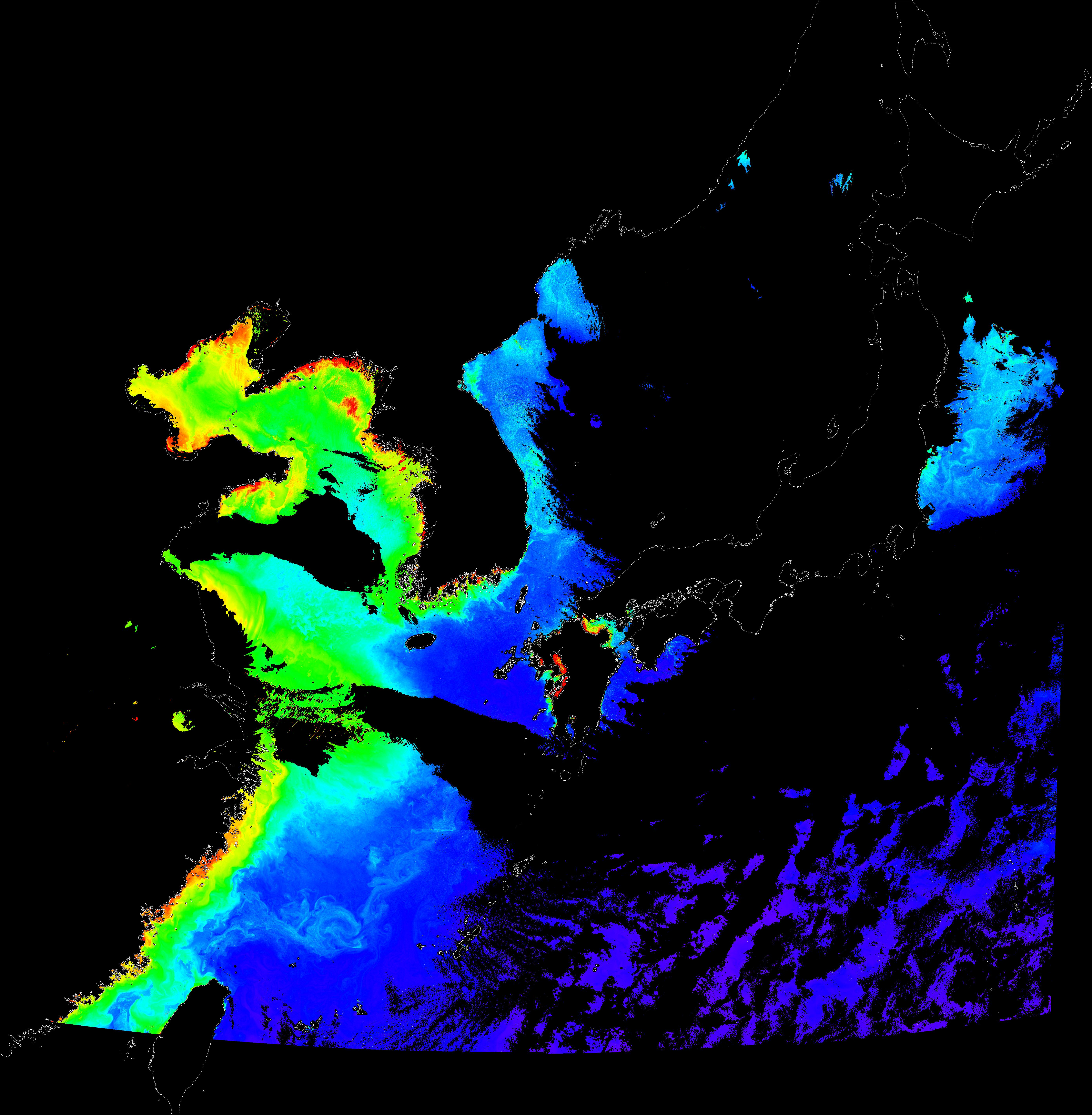 o 2016년 2월 9일 천리안 GOCI 클로로필 a 위성영상입니다.