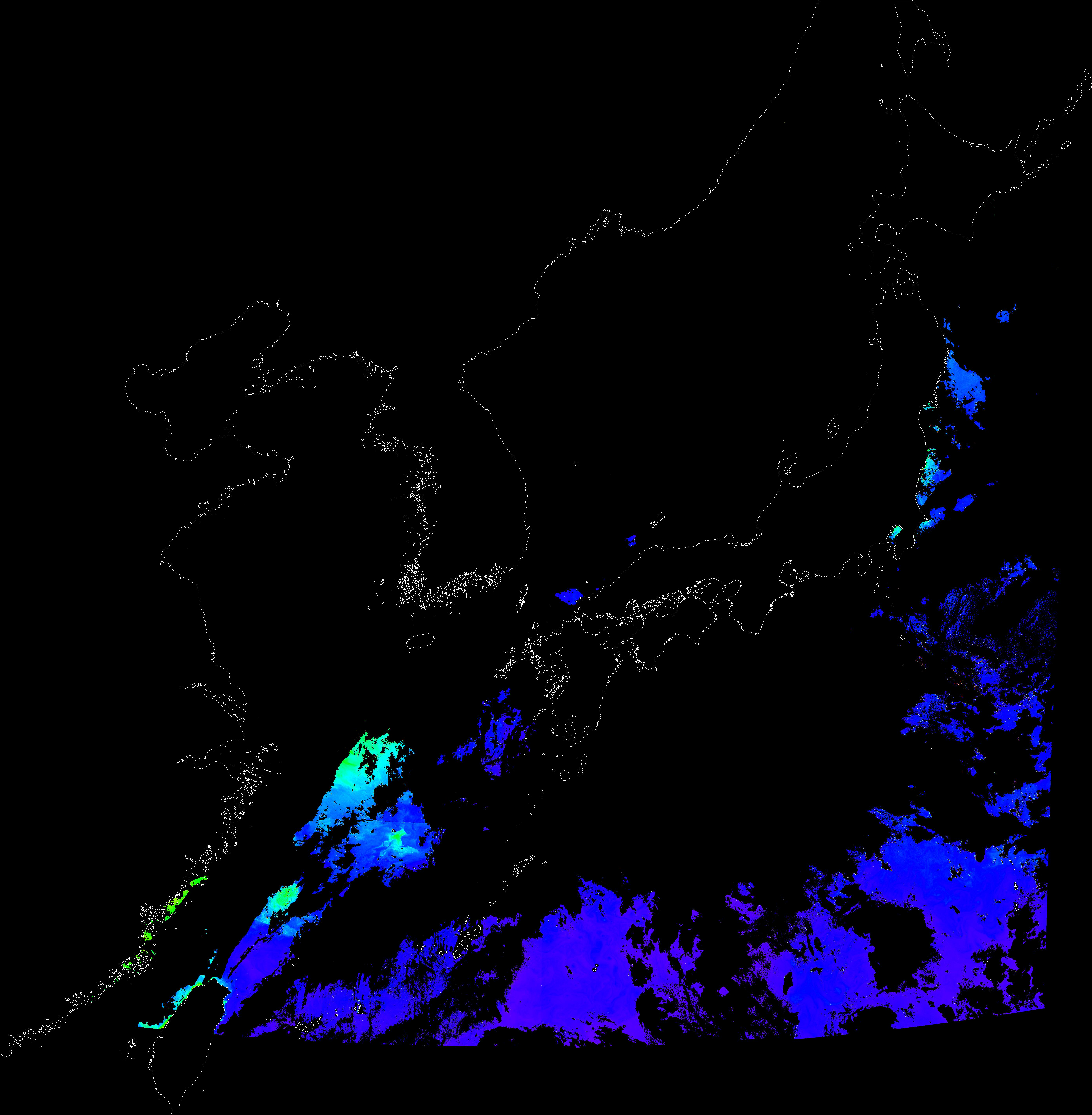 o 2016년 2월 13일 천리안 GOCI 클로로필 a 위성영상입니다.