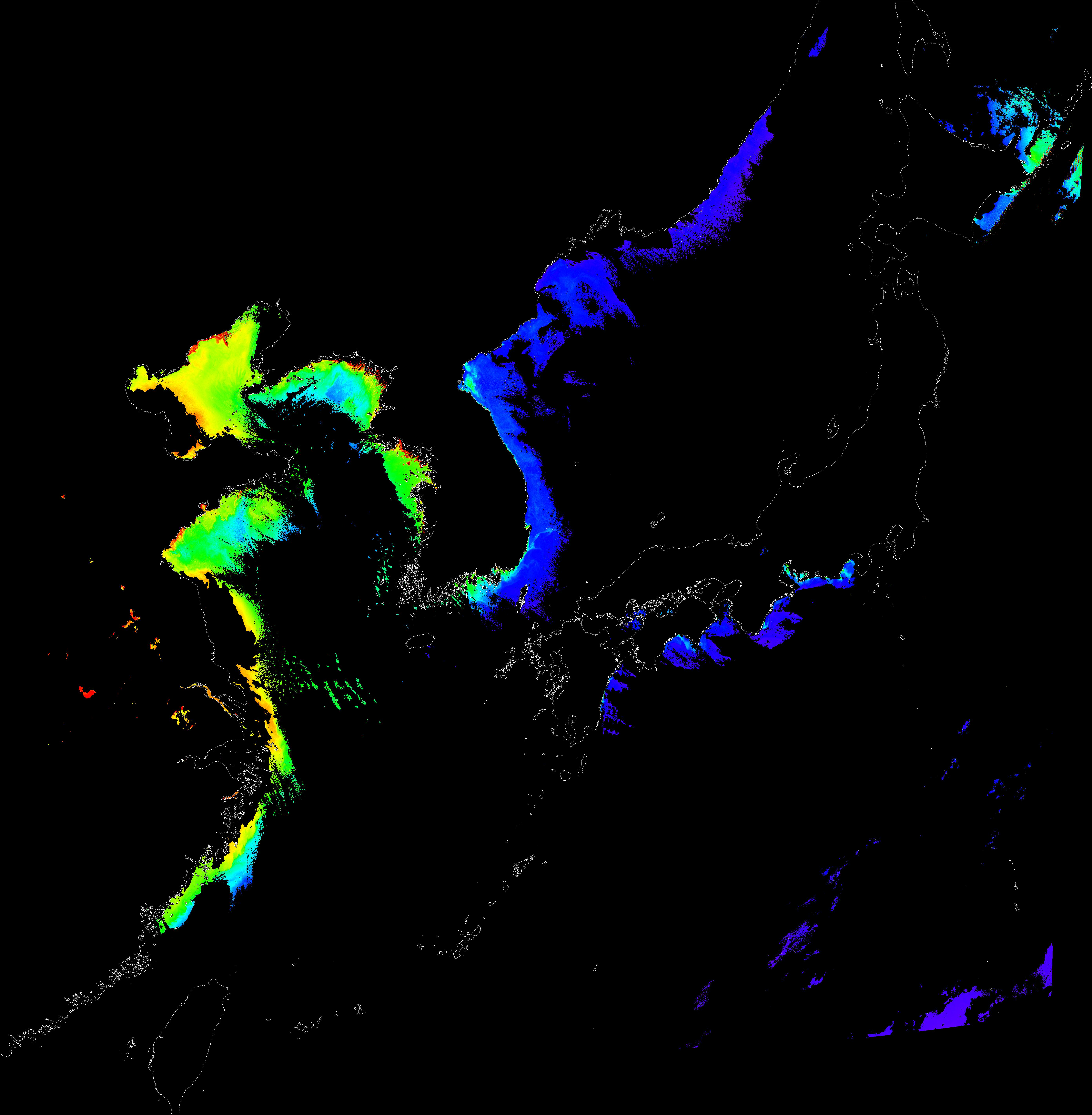 o 2016년 2월 15일 천리안 GOCI 클로로필 a 위성영상입니다.