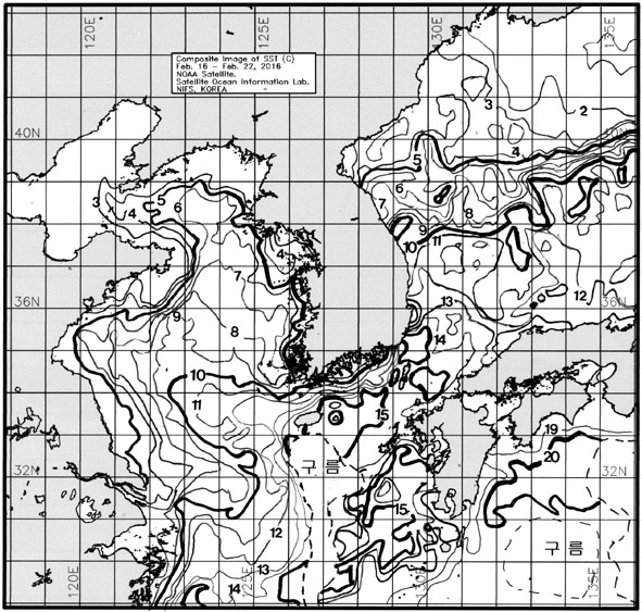 ◦ 금주(2016. 02. 16 ~ 02. 22)의 한국근해 표면수온은 대화퇴 근해 9~11도, 울릉도-독도 근해 11~12도, 대마도 근해 14~15도, 제주도 근해 14~15도, 이어도 근해 9~11도, 가거초 근해 11~12도, 어청도 근해 6~7도, 백령도 근해 5∼6도로 나타납니다. ◦ 「평년에 비해」대화퇴 근해 3.2도 높게, 울릉도-독도 근해 1.1도 높게, 대마도 근해 비슷하게, 제주도 근해 비슷하게, 이어도 근해 0.4도 높게, 가거초 근해 1.6도 높게, 어청도 근해 1도 높게 나타납니다. ◦ 「전년에 비해」대화퇴 근해 5.5도 높게, 울릉도-독도 근해 0.5도 낮게, 대마도 근해 0.5도 높게, 제주도 근해 0.5도 낮게, 이어도 근해 0.5도 높게, 가거초 근해 3.0도 높게, 어청도 근해 비슷하게, 백령도 근해 0.5도 높게 나타납니다. ◦ 수온 전선대는 우리나라 제주해협에서 대한해협까지 14도를 중심으로 형성됩니다. |