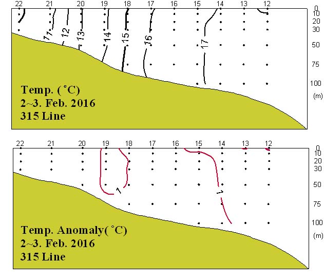 ◦ 2016년 2월 2∼3일 국립수산과학원 기후변화연구과에서 조사한 동중국해 북부해역(315선)의 수온 수직분포도와 평년편차도입니다.