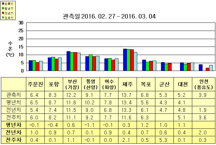 ◦ 금주(2016. 02. 27 ~ 03. 04)의 한반도 연안 표면수온은 동해 연안역에서 섭씨 6.0~12.5도, 남해 연안역 7.5~14.0도, 서해 연안역에서 3.5~7.0도로 나타납니다. ◦ 평년에 비해 주문진 비슷하게, 포항 0.4도 낮게, 부산(기장)0.6도 높게, 통영(산양) 1.1도 낮음을 제외한 남해 연안역은 비슷하게, 서해 연안역은 1.0~1.5도 높게 나타납니다. ◦ 전년에 비해 동해 연안역은 0.5~1.0도 높게, 통영(산양) 비슷함을 제외한 남해 연안역은 0.5~1도 높게, 서해 연안역은 0.5~2도 높게 나타납니다. |
