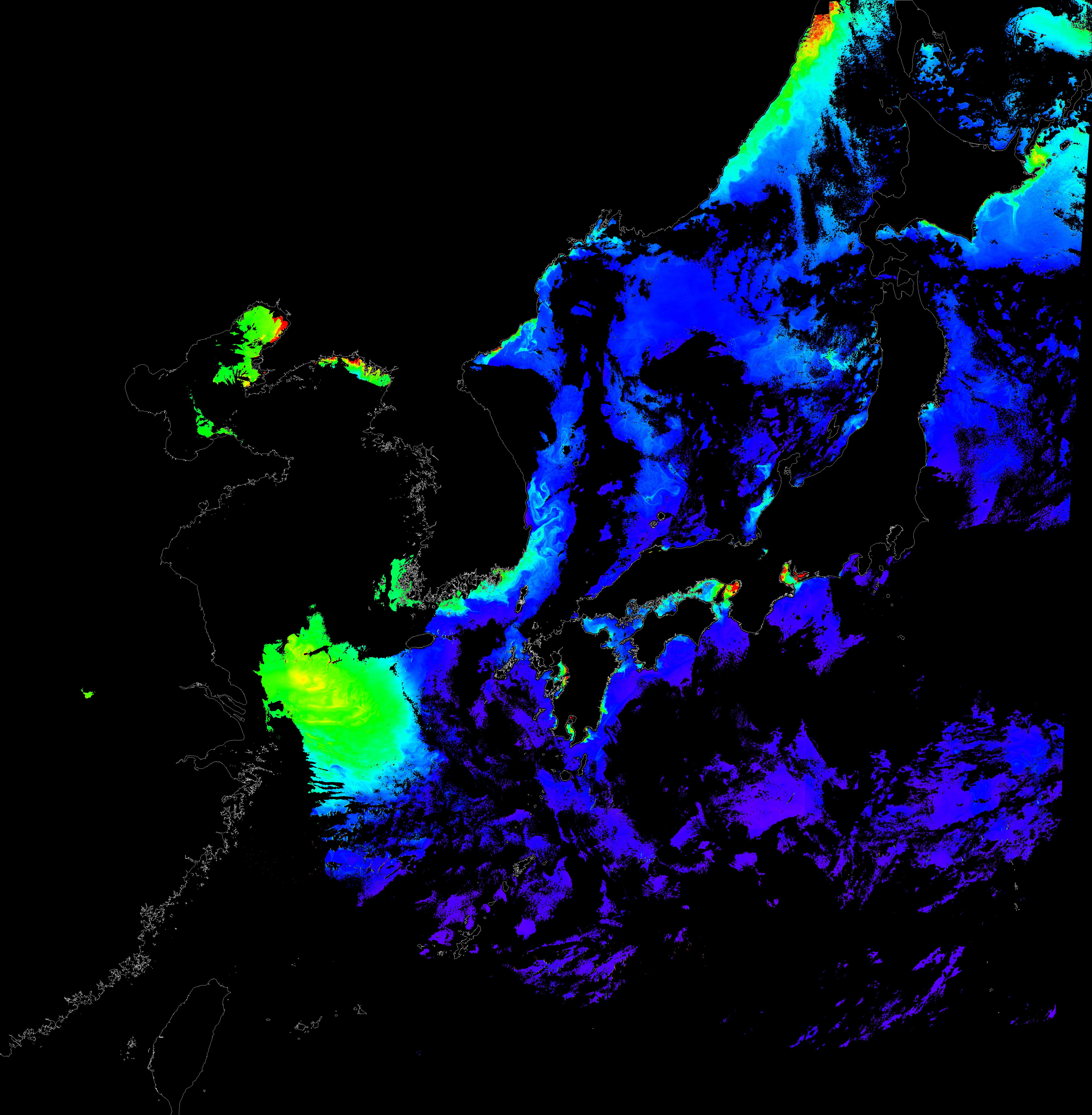 o 2016년 3월 12일 천리안 GOCI 클로로필 a 위성영상입니다.