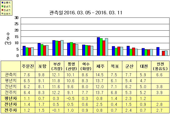◦ 금주(2016. 03. 05 ~ 03. 11)의 한반도 연안 표면수온은 동해 연안역에서 섭씨 7.5~12.5도, 남해 연안역 8.5~14.5도, 서해 연안역에서 5.5~8.0도로 나타납니다. ◦ 평년에 비해 부산(기장) 비슷함을 제외한 동해 연안역은 0.4~1.5도 높게, 남해 연안역은 통영(산양) 0.5도 낮게, 여수(화양) 비슷하게, 제주 0.8도 높게, 서해 연안역은 1.0~2.5도 높게 나타납니다. ◦ 전년에 비해 동해 연안역은 0.5~2.0도 높게, 남해 연안역은 0.5~2.5도 높게, 서해 연안역은 0.5~3.0도 높게 나타납니다. =$row['content']?> =$row['content']?> =$row['content']?> |