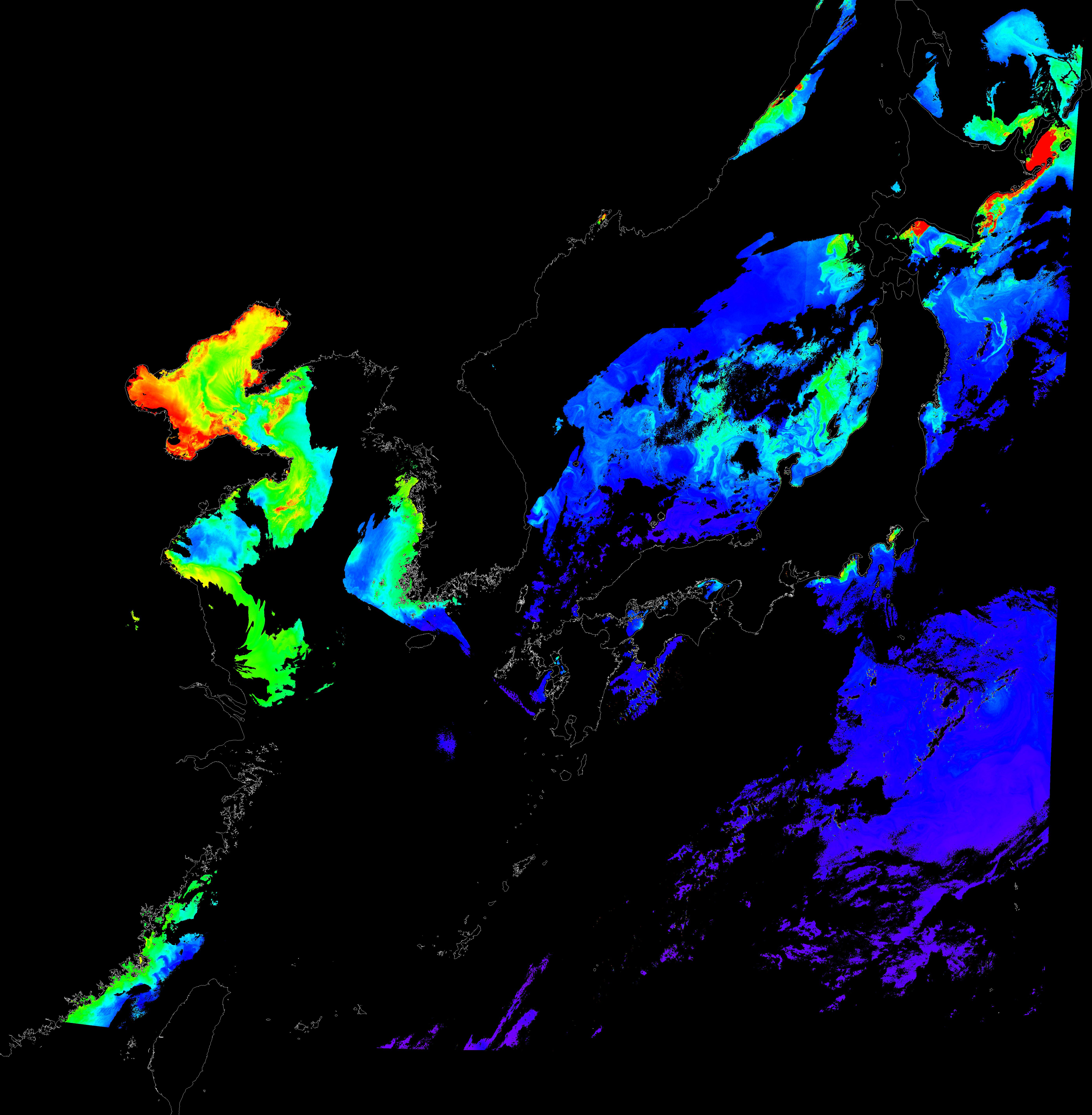 o 2016년 3월 27일 천리안 GOCI 클로로필 a 위성영상입니다.