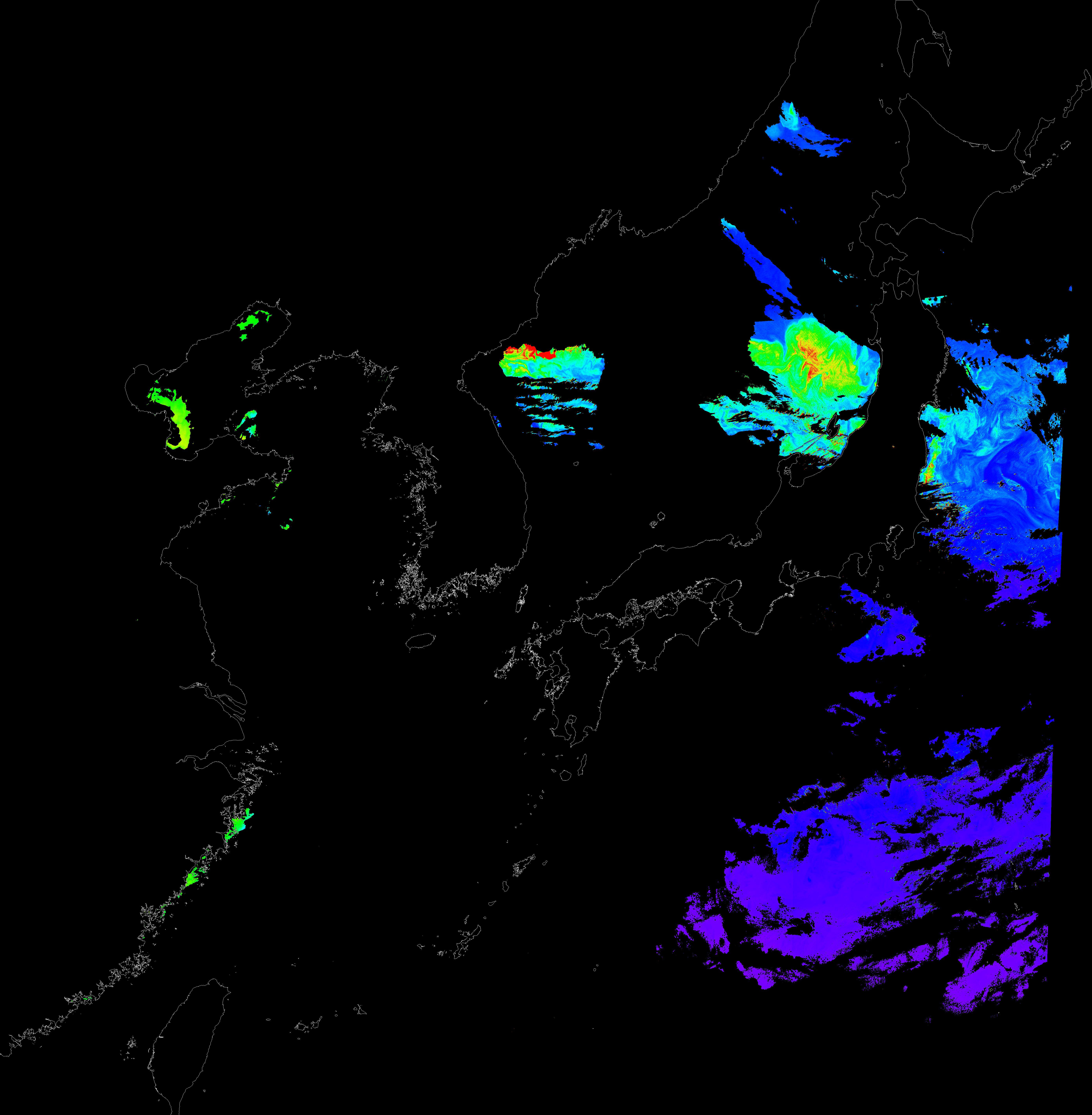 o 2016년 3월 31일 천리안 GOCI 클로로필 a 위성영상입니다.