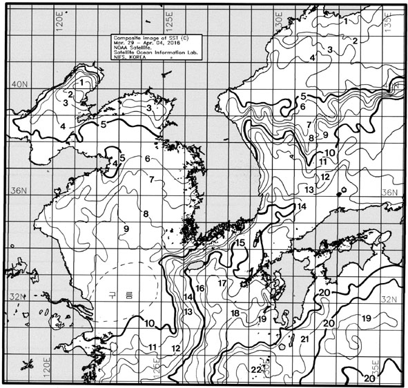 ◦ 금주(2016. 03. 29 ~ 04. 04)의 한국근해 표면수온은 대화퇴 근해 9~11도, 울릉도-독도 근해 11~13도, 대마도 근해 14~15도, 제주도 근해 14~16도, 이어도 근해 9~10도, 가거초 근해 8~9도, 어청도 근해 6~7도, 백령도 근해 5∼6도로 나타납니다. ◦ 「평년에 비해」대화퇴 근해 2.7도 높게, 울릉도-독도 근해 1.6도 높게, 대마도 근해 비슷하게, 제주도 근해 0.7도 높게, 이어도 근해 0.6도 낮게, 가거초 근해 0.8도 낮게, 어청도 근해 비슷하게 나타납니다. ◦ 「전년에 비해」대화퇴 근해 5.5도 높게, 울릉도-독도 근해 1.5도 높게, 대마도 근해 비슷하게, 제주도 근해 비슷하게, 이어도 근해 2도 낮게, 가거초 근해 1도 낮게, 어청도 근해 1도 낮게, 백령도 근해 1도 높게 나타납니다. ◦ 수온 전선대는 우리나라 제주해협에서 대한해협까지 15도를 중심으로 형성됩니다. |