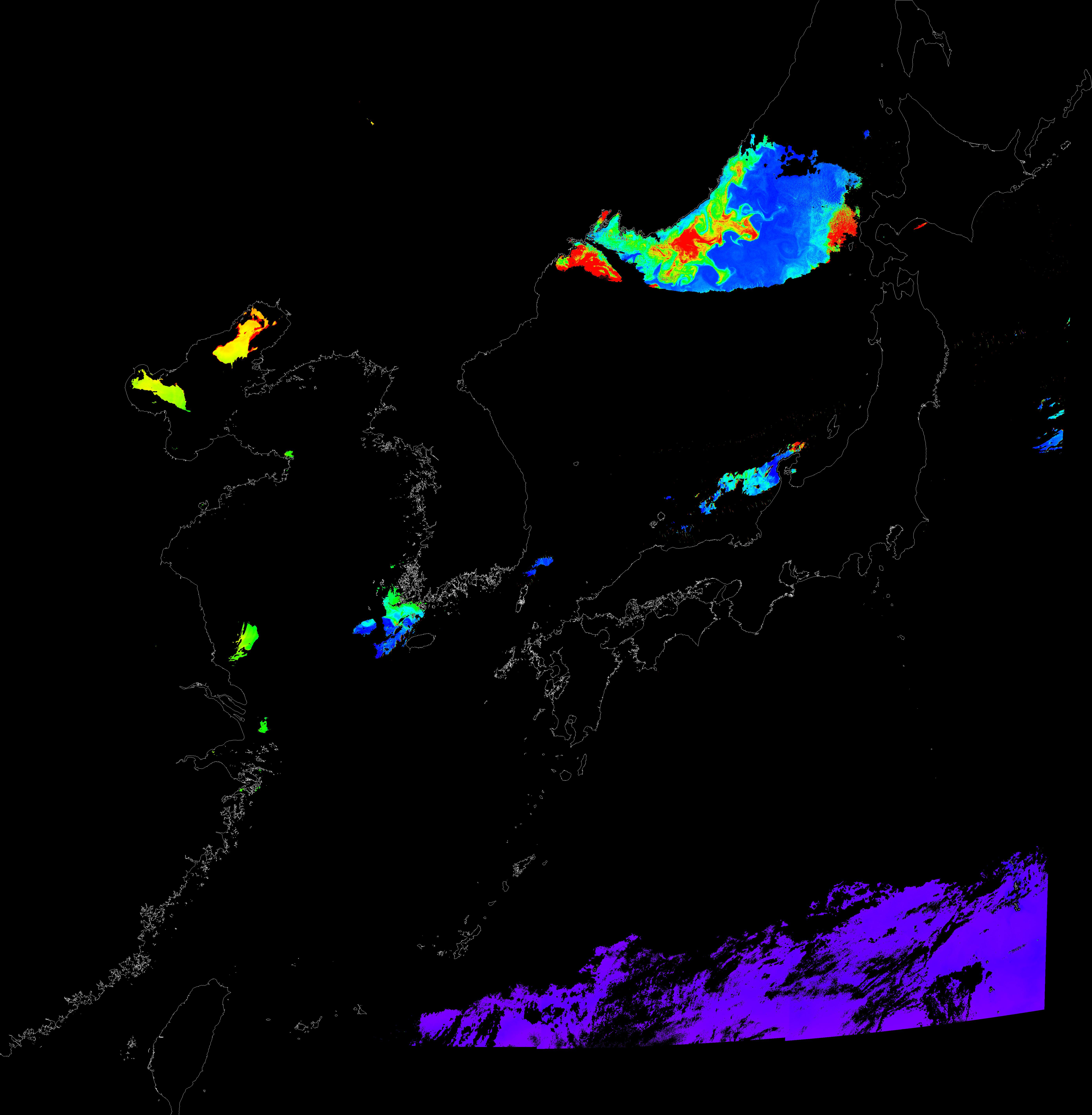 o 2016년 4월 9일 천리안 GOCI 클로로필 a 위성영상입니다.