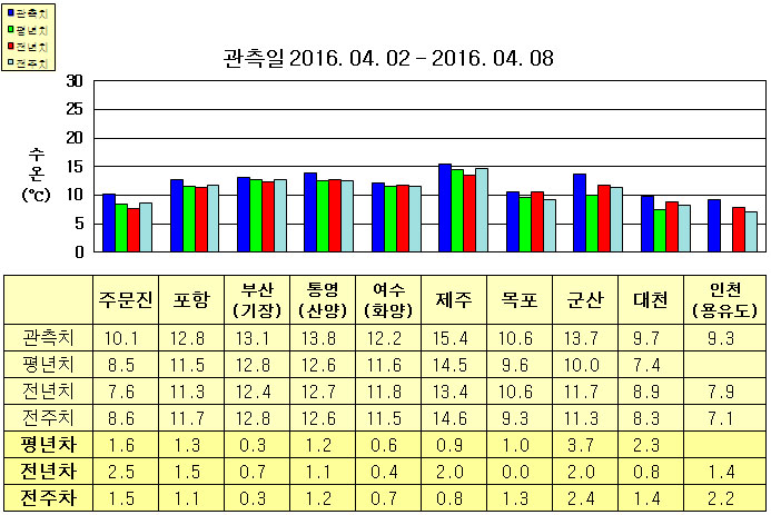 ◦ 금주(2016. 04. 02 ~ 04. 08)의 한반도 연안 표면수온은 동해 연안역에서 섭씨 10.0~13.5도, 남해 연안역 12.0~15.5도, 서해 연안역에서 9~14도로 나타납니다. ◦ 평년에 비해 부산(기장) 비슷함을 제외한 동해 연안역은 1~2도 높게, 남해 연안역은 0.5~1.0도 높게, 서해 연안역은 1~4도 높게 나타납니다. ◦ 전년에 비해 동해 연안역은 0.5~2.5도 높게, 남해 연안역은 0.5~2.0도 높게, 목포 비슷함을 제외한 서해 연안역은 0.5~2.0도 높게 나타납니다. =$row['content']?> =$row['content']?> =$row['content']?> |