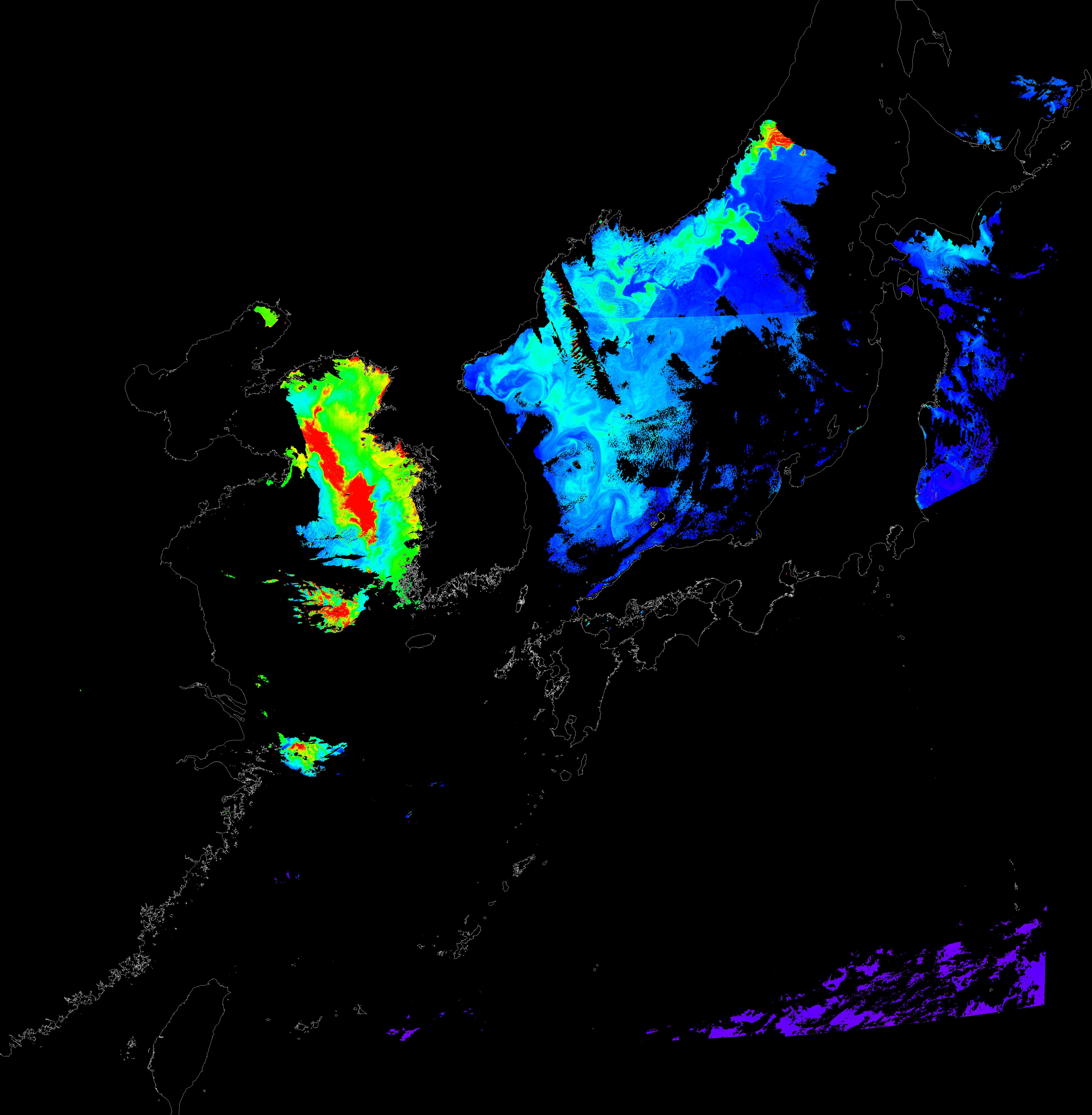 o 2016년 4월 11일 천리안 GOCI 클로로필 a 위성영상입니다.