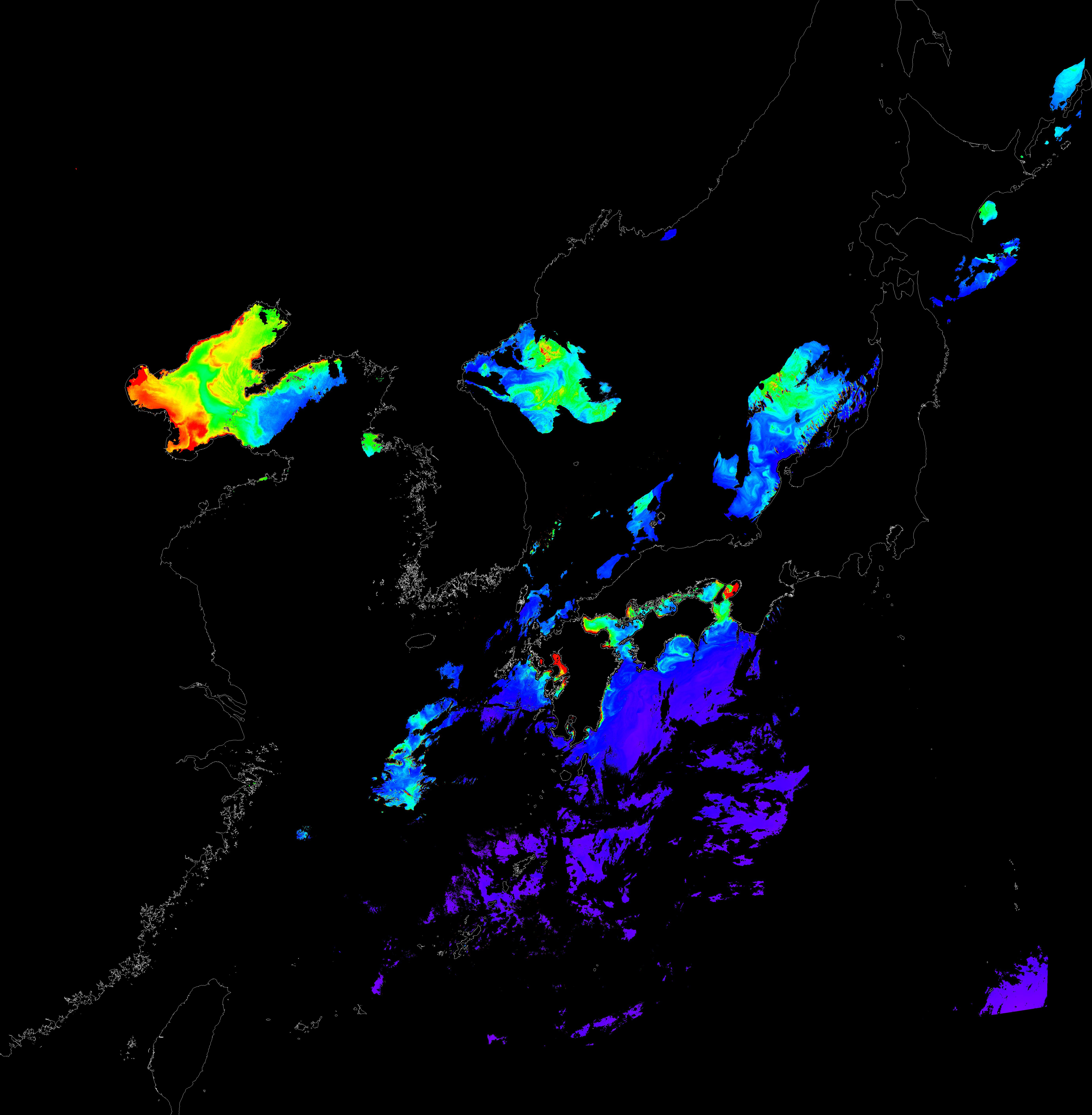 o 2016년 4월 14일 천리안 GOCI 클로로필 a 위성영상입니다.