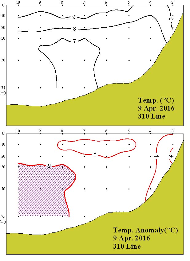 ◦ 2016년 4월 9일 국립수산과학원 서해수산연구소에서 조사한 310선 (영광 서방)의 수직수온분포도 및 평년편차도입니다. ◦ 조사해역 내에서 수온약층은 형성되지 않았고, 7~9℃의 수온분포를 보였습니다. =$row['content']?> =$row['content']?> =$row['content']?> |