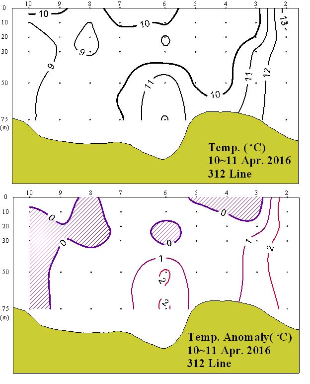 ◦ 2016년 4월 10~11일 국립수산과학원 서해수산연구소에서 조사한 312선(제주해협 서방)의 수직수온분포도 및 평년편차도입니다. ◦ 평년에 비해 관측해역의 정점 3~5 사이 표층에서와 정점 7~10 사이 일부해역에서 1℃ 내외의 저온분포를 보였고, 그 외 대부분의 조사해역에서 1~2℃ 내외의 고온 분포를 보였습니다.