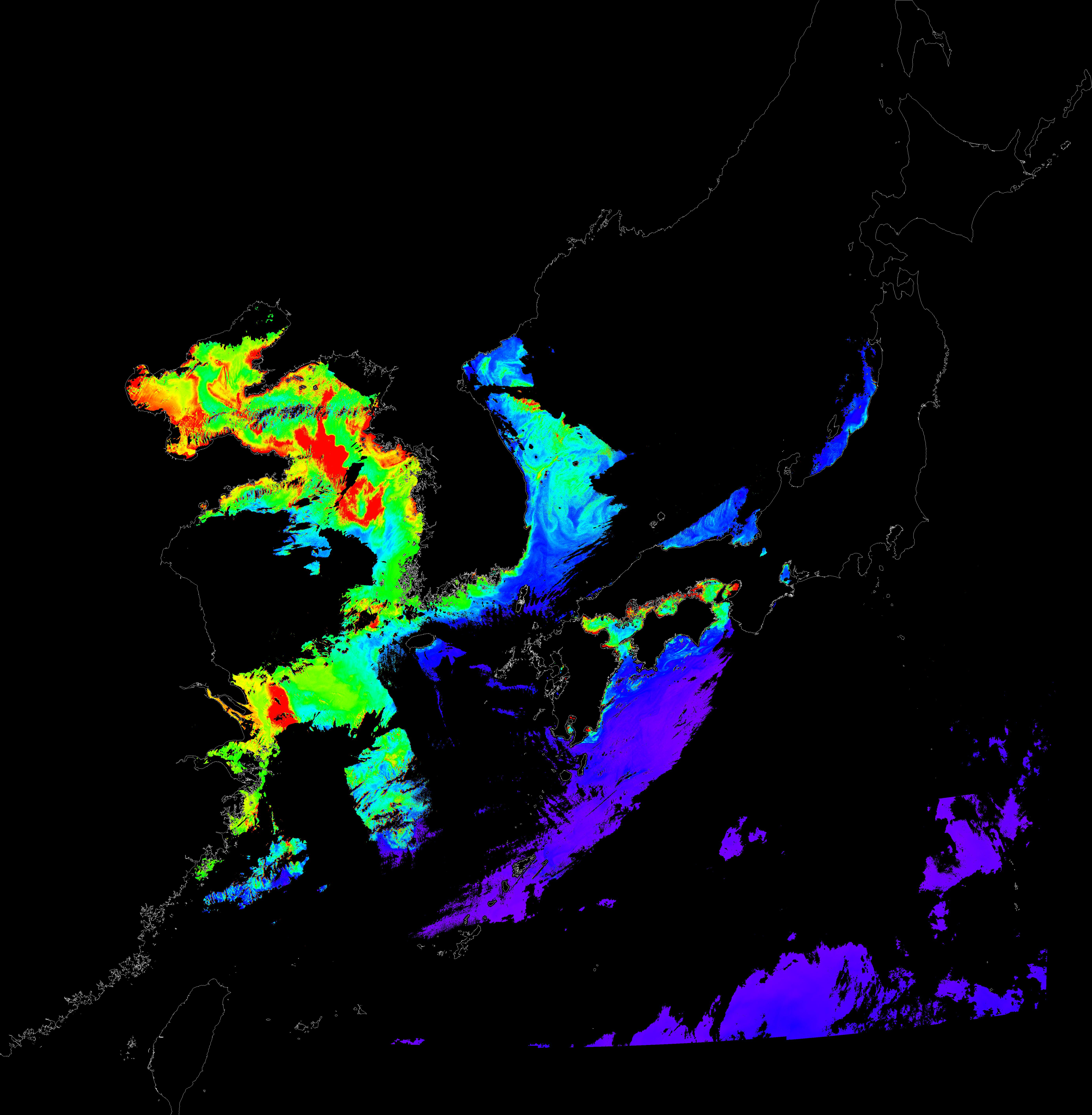 o 2016년 4월 17일 천리안 GOCI 클로로필 a 위성영상입니다.