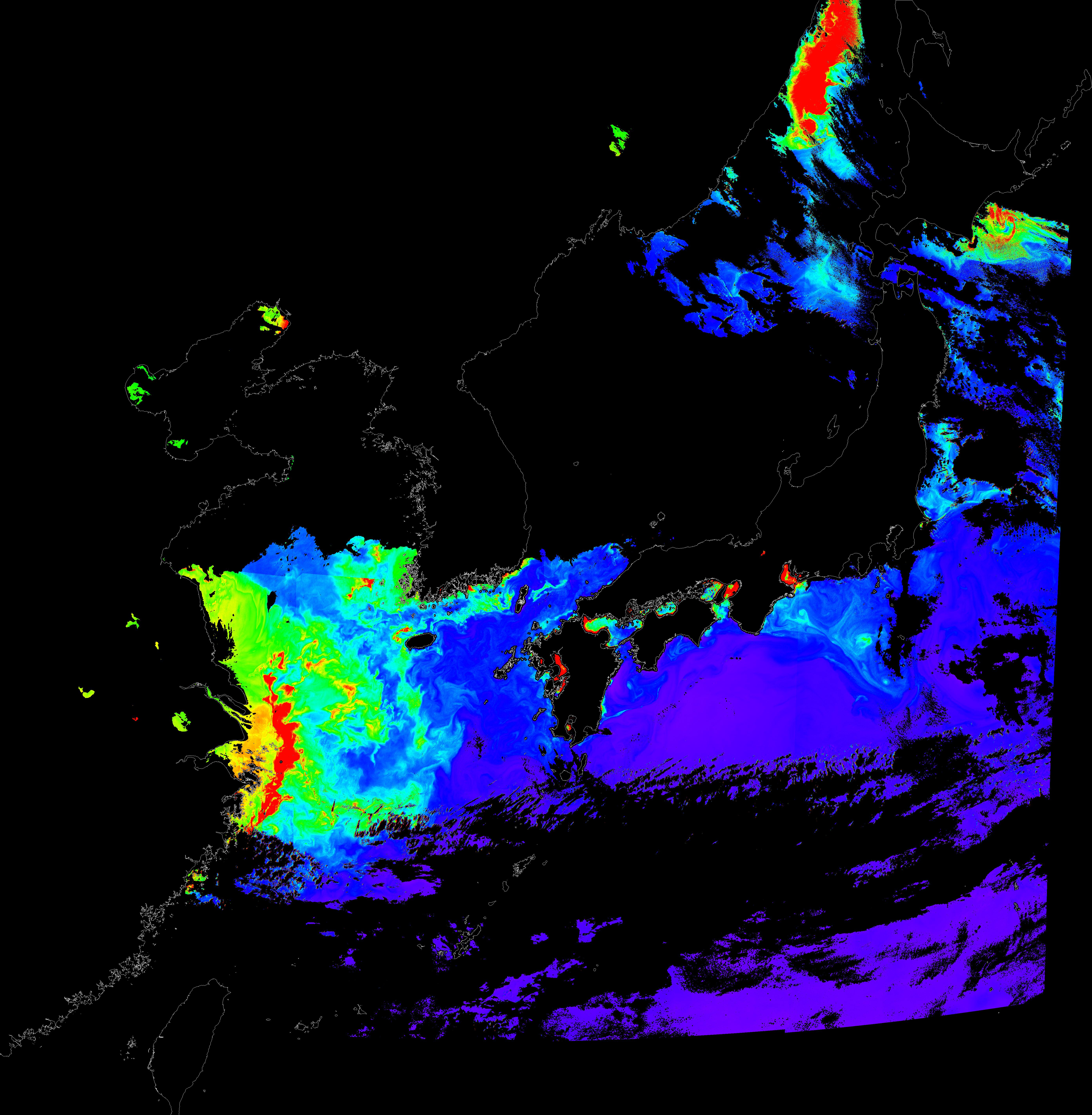 o 2016년 4월 30일 천리안 GOCI 클로로필 a 위성영상입니다.