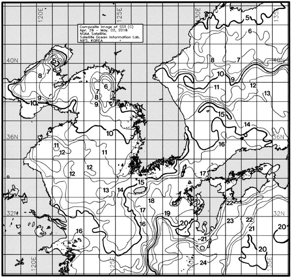 ◦ 금주(2016. 04. 26 ~ 05. 02)의 한국근해 표면수온은 대화퇴 근해 12~13도, 울릉도-독도 근해 14~16도, 대마도 근해 16~17도, 제주도 근해 15~16도, 이어도 근해 13~14도, 가거초 근해 11~12도, 어청도 근해 9~10도, 백령도 근해 6∼8도로 나타납니다. ◦ 「평년에 비해」대화퇴 근해 3.3도 높게, 울릉도-독도 근해 2.3도 높게, 대마도 근해 0.8도 높게, 제주도 근해 0.5도 높게, 이어도 근해 1.1도 높게, 가거초 근해 0.7도 높게, 어청도 근해 0.8도 높게 나타납니다. ◦ 「전년에 비해」대화퇴 근해 3.0도 높게, 울릉도-독도 근해 1.5도 높게, 대마도 근해 2도 높게, 제주도 근해 1도 높게, 이어도 근해 비슷하게, 가거초 근해 1.5도 낮게, 어청도 근해 2도 낮게, 백령도 근해 1.5도 낮게 나타납니다. ◦ 수온 전선대는 우리나라 제주해협에서 대한해협까지 15도를 중심으로 형성됩니다. =$row['content']?> =$row['content']?> =$row['content']?> |