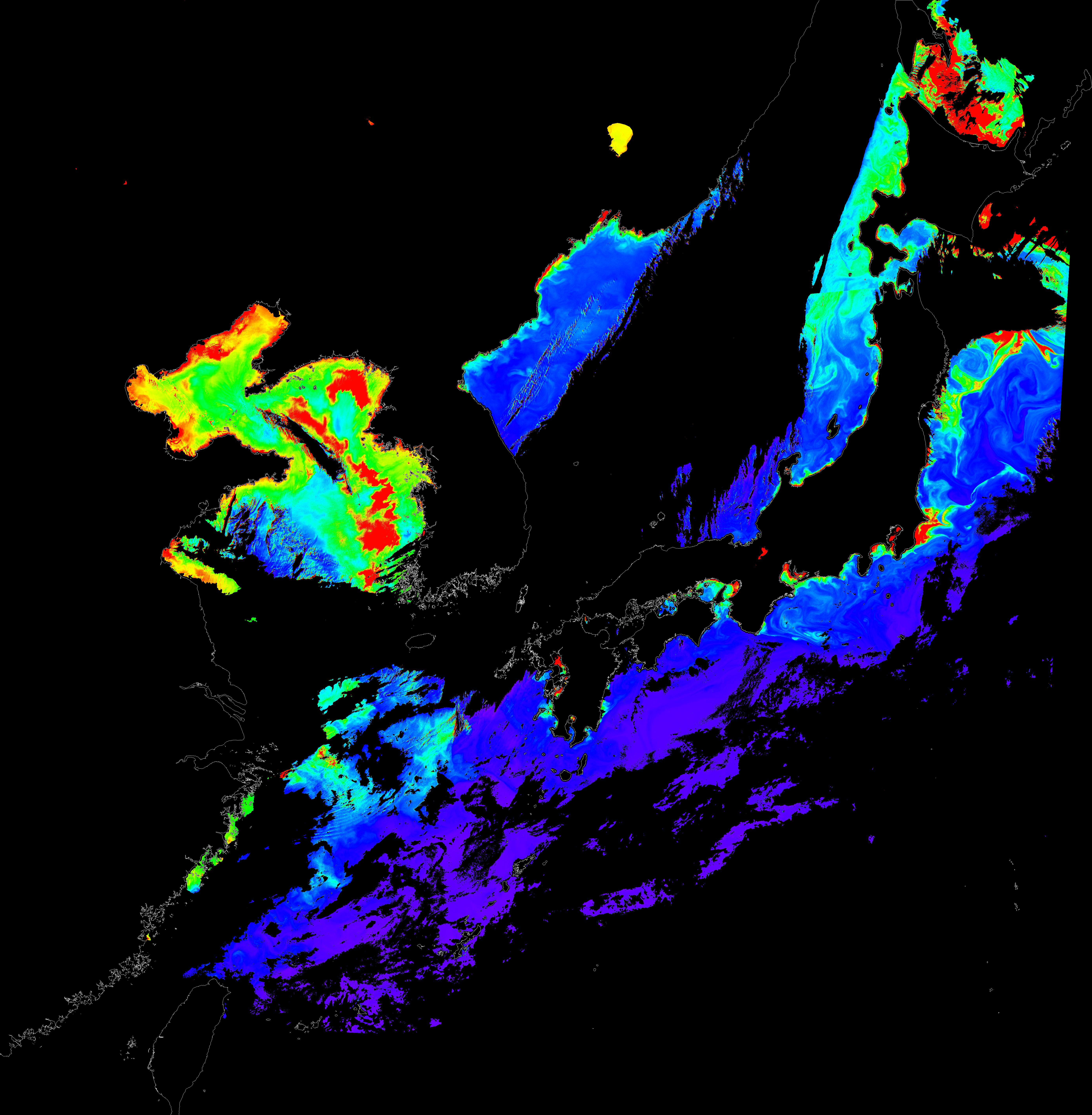 o 2016년 5월 13일 천리안 GOCI 클로로필 a 위성영상입니다.