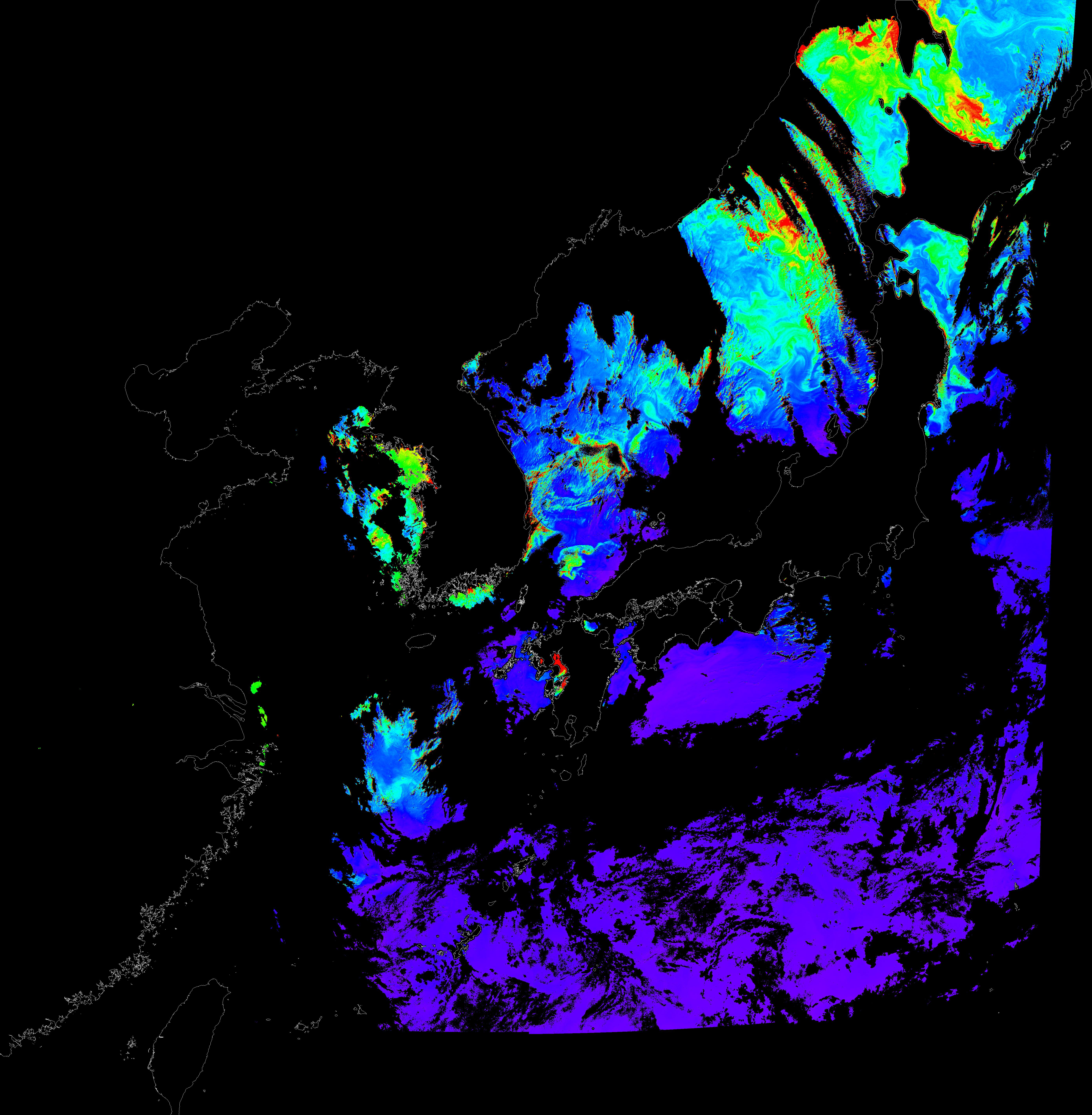 o 2016년 5월 14일 천리안 GOCI 클로로필 a 위성영상입니다.