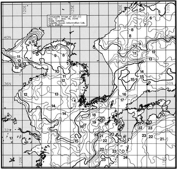 ◦ 금주(2016. 05. 10 ~ 05. 16)의 한국근해 표면수온은 대화퇴 근해 11~13도, 울릉도-독도 근해 15~16도, 대마도 근해 16~18도, 제주도 근해 15~17도, 이어도 근해 13~14도, 가거초 근해 11~13도, 어청도 근해 12~14도, 백령도 근해 8∼10도로 나타납니다. ◦ 「평년에 비해」대화퇴 근해 비슷하게, 울릉도-독도 근해 0.9도 높게, 대마도 근해 비슷하게, 제주도 근해 0.5도 낮게, 이어도 근해 2.1도 낮게, 가거초 근해 1.8도 낮게, 어청도 근해 1도 높게 나타납니다. ◦ 「전년에 비해」대화퇴 근해 0.5도 높게, 울릉도-독도 근해 1도 높게, 대마도 근해 0.5도 높게, 제주도 근해 1도 높게, 이어도 근해 1도 낮게, 가거초 근해 1.5도 낮게, 어청도 근해 2도 높게, 백령도 근해 0.5도 낮게 나타납니다. ◦ 수온 전선대는 우리나라 제주해협에서 대한해협까지 16도를 중심으로 형성됩니다. =$row['content']?>=$row['content']?> =$row['content']?> |