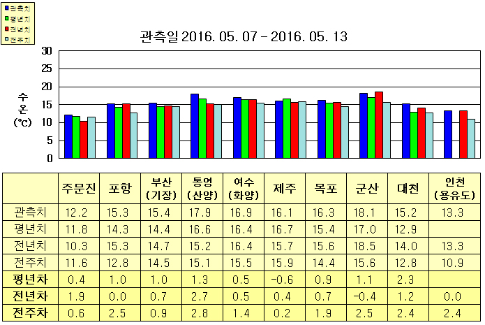 ◦ 금주(2016. 05. 07 ~ 05. 13)의 한반도 연안 표면수온은 동해 연안역에서 섭씨 12.0~15.5도, 남해 연안역 16~18도, 서해 연안역에서13.0~18.5도로 나타납니다. ◦ 평년에 비해 동해 연안역은 0.5~1.0도 높게, 제주 0.6도 낮음을 제외한 남해 연안역은 0.5~1.5도 높게, 서해 연안역은 0.5~2.5도 높게 나타납니다. ◦ 전년에 비해 포항 비슷함을 제외한 동해 연안역은 0.5~2.0도 높게, 남해 연안역은 0.5~3.0도 높게, 인천(용유도) 비슷하게, 군산 0.4도 낮음을 제외한 서해 연안역은 0.5~1.5도 높게 나타납니다. =$row['content']?>=$row['content']?> =$row['content']?> |