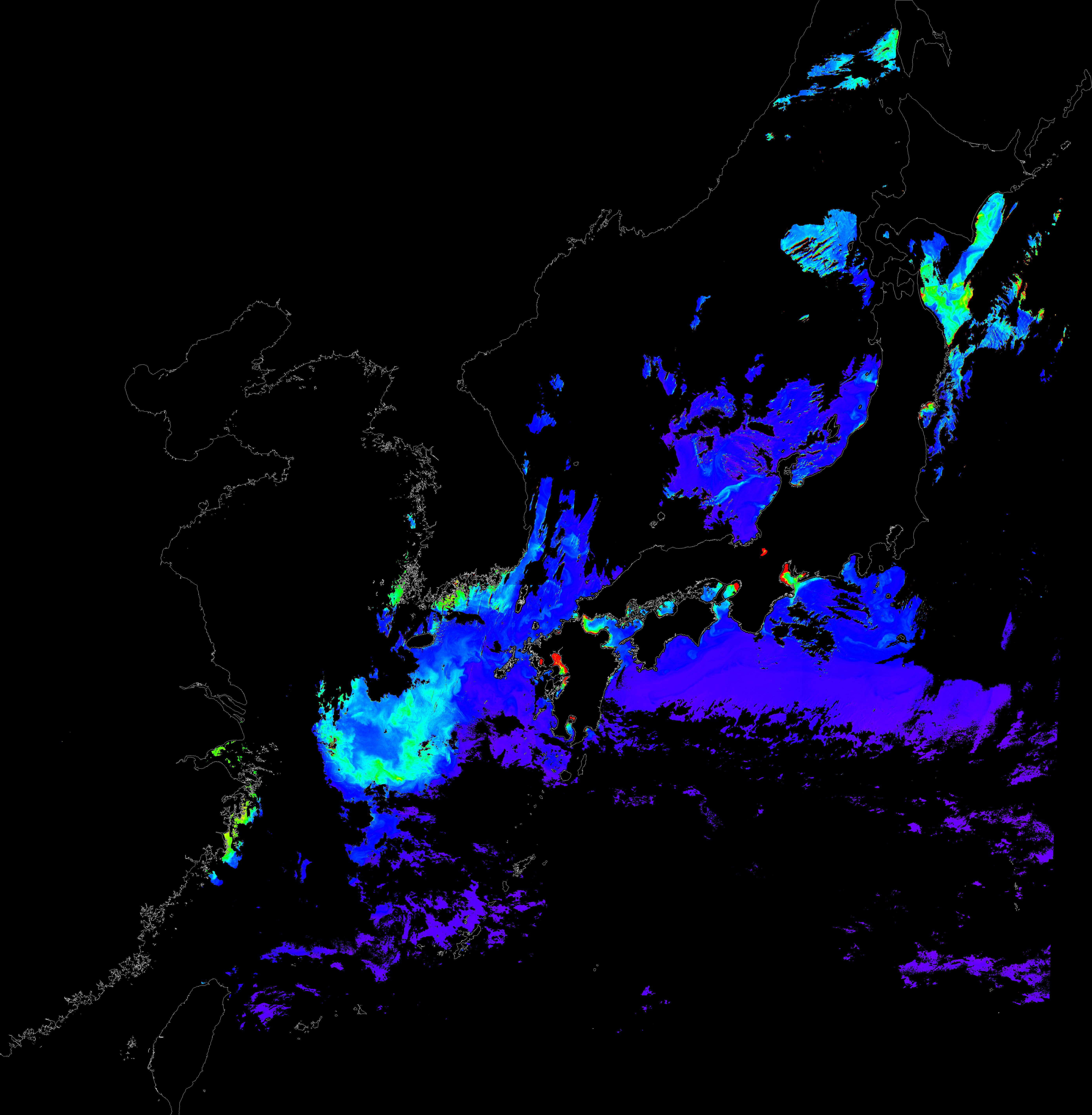 o 2016년 5월 23일 천리안 GOCI 클로로필 a 위성영상입니다.