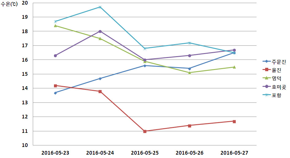 o 국립수산과학원 실시간 관측정보 시스템에서 관측한 동해 연안역의 최근 5일간(5월 23일 ∼5월 27일)의 수온 변화입니다. o 지난 5월 23일 10시 표층수온은 울진 14.2℃, 영덕 18.4℃였으며, 현재 27일 10시 표층수온은 울진 11.5℃, 영덕 15.5℃로, 24일에 비해 수온이 약 2~3℃ 낮게 나타나고 있습니다. o 동해 남부 연안의 어업인께서는 수온 변화에 대한 피해가 발생하지 않도록 양식생물 관리에 주의하시기 바랍니다. o 냉수대가 발생하는 경우, 수온이 급격하게 변화해 양식생물의 폐사와 연안어업 어획량의 감소뿐 만 아니라 연안에 짙은 해무가 발생해 선박 안전사고가 우려되오니 각별한 주의가 필요합니다. =$row['content']?> =$row['content']?> =$row['content']?> |