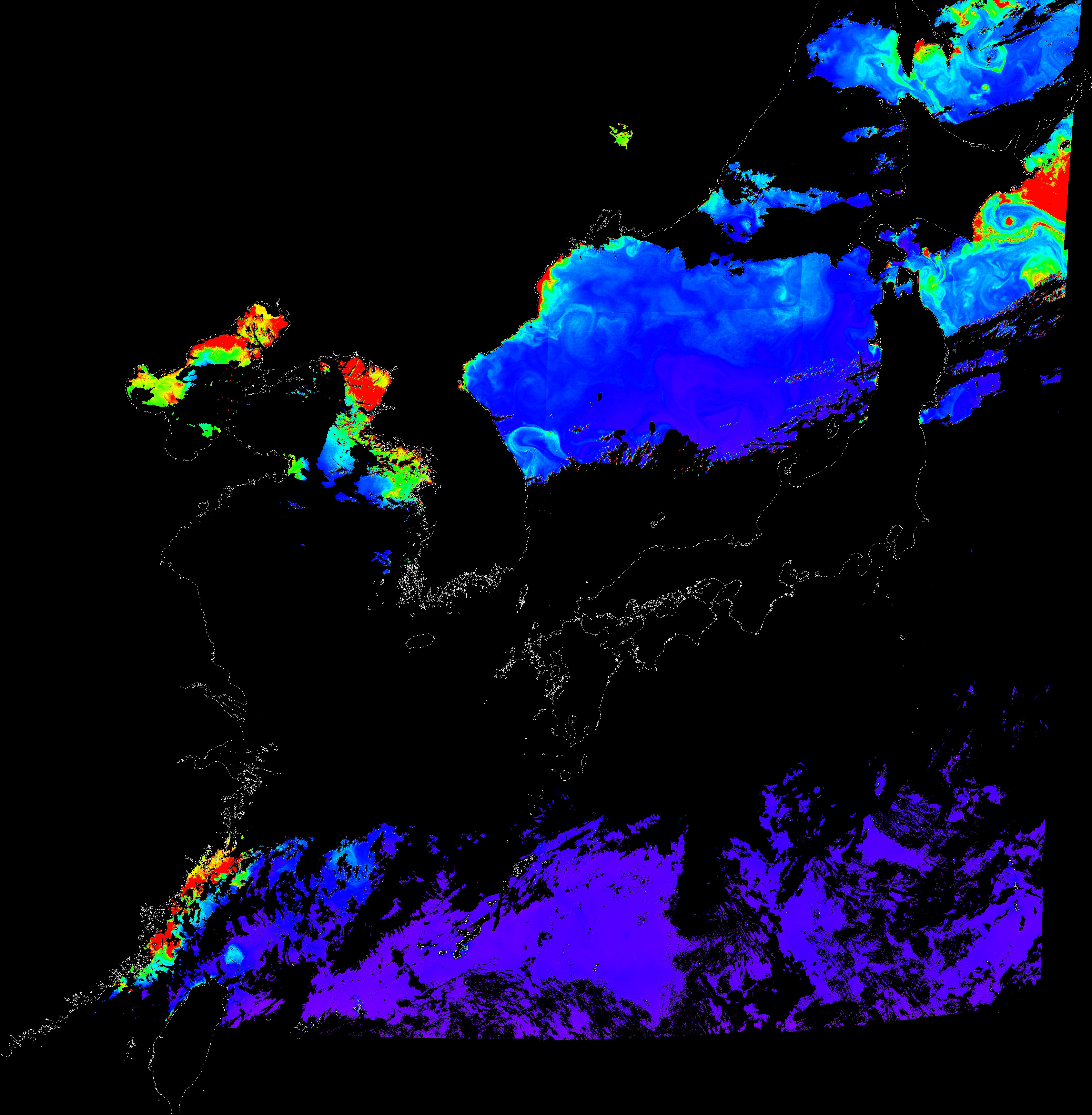 o 2016년 5월 28일 천리안 GOCI 클로로필 a 위성영상입니다.