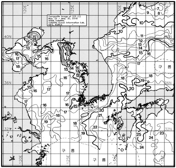 ◦ 금주(2016. 05. 24 ~ 05. 30)의 한국근해 표면수온은 대화퇴 근해 14~16도, 울릉도-독도 근해 17~18도, 대마도 근해 19~21도, 제주도 근해 17~19도, 이어도 근해 17~18도, 가거초 근해 14~15도, 어청도 근해 16~17도, 백령도 근해 11∼13도로 나타납니다. ◦ 「평년에 비해」대화퇴 근해 1.8도 높게, 울릉도-독도 근해 1.6도 높게, 대마도 근해 1.5도 높게, 제주도 근해 0.3도 높게, 이어도 근해 0.5도 높게, 가거초 근해 0.8도 낮게, 어청도 근해 2.2도 높게 나타납니다. ◦ 「전년에 비해」대화퇴 근해 0.5도 높게, 울릉도-독도 근해 비슷하게, 대마도 근해 1도 높게, 제주도 근해 비슷하게, 이어도 근해 0.5도 낮게, 가거초 근해 3도 낮게, 어청도 근해 0.5도 낮게, 백령도 근해 비슷하게 나타납니다. ◦ 수온 전선대는 우리나라 제주해협에서 대한해협까지 18도를 중심으로 형성됩니다. |